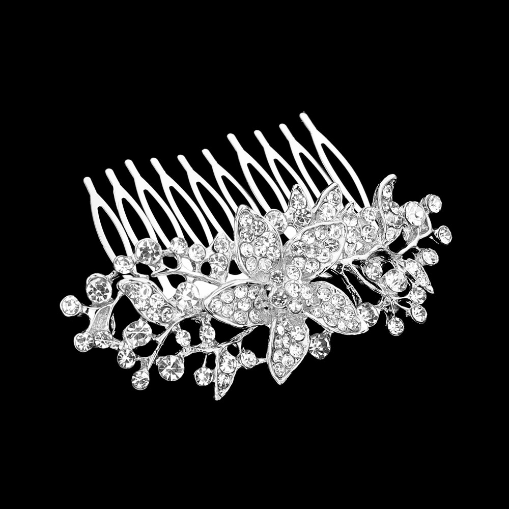 Details • Size : 3" X 1.4" • Enhance your hairstyle with this sparkling floral crystal hair comb, crafted to add a touch of glamour and grace. Featuring dazzling crystal blossoms and delicate detailing, it’s perfect for weddings, parties, or elegant occasions, offering a timeless accent that shines beautifully. • Lead and Nickel Compliant
