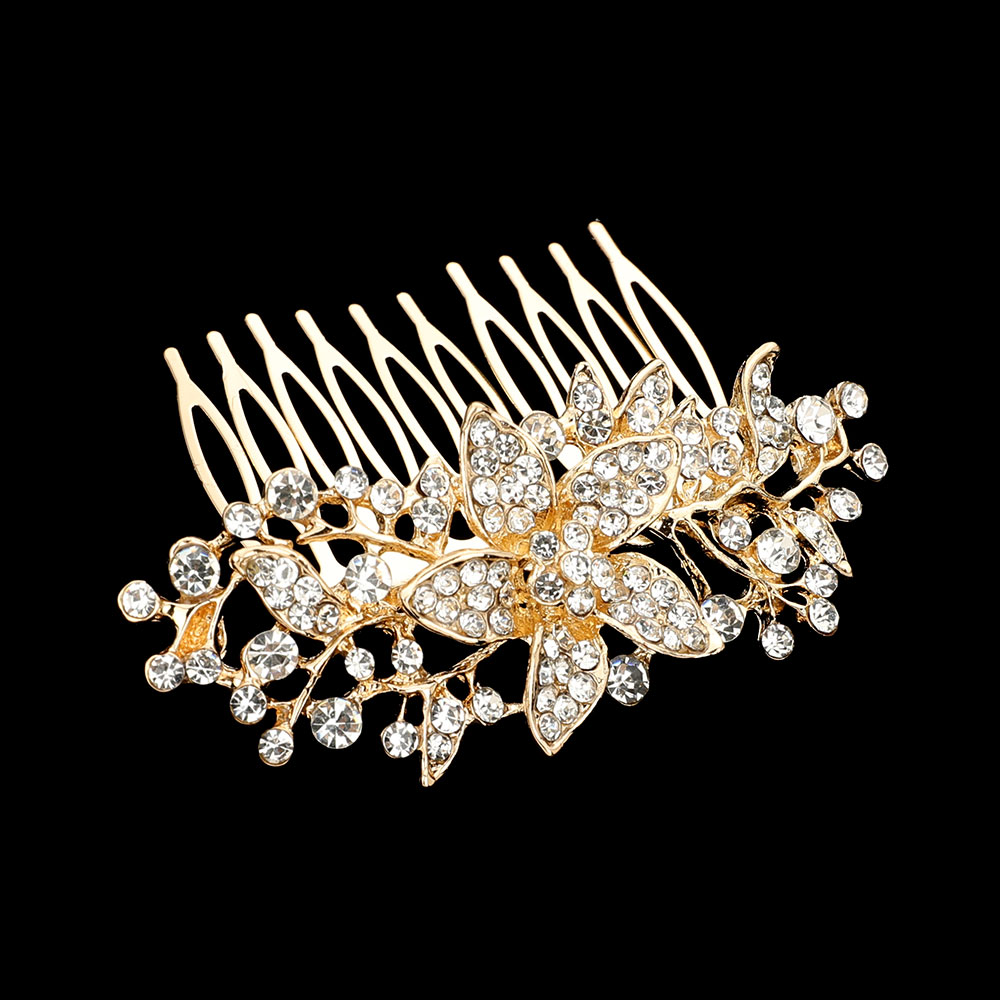 Details • Size : 3" X 1.4" • Enhance your hairstyle with this sparkling floral crystal hair comb, crafted to add a touch of glamour and grace. Featuring dazzling crystal blossoms and delicate detailing, it’s perfect for weddings, parties, or elegant occasions, offering a timeless accent that shines beautifully. • Lead and Nickel Compliant