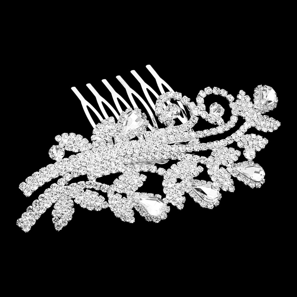 • Teardrop crystal bridal hair comb with radiant rhinestones and leaf detailing, perfect for adding elegance to wedding hairstyles. A sparkling accessory designed to complement updos and special occasion looks.