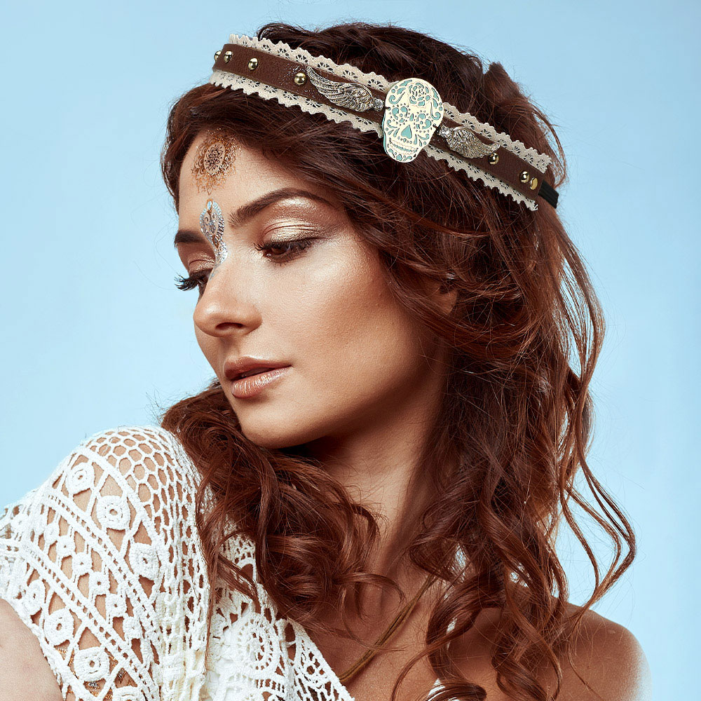 Day of the Dead Mexican Sugar Skull & Wings Faux Leather Lace Stretch Headband