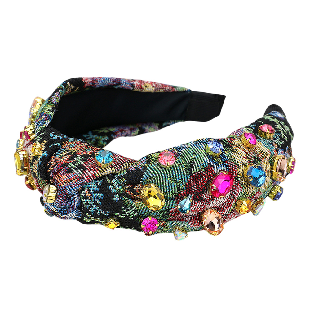 Details • Size : 1.75" H • Shine with elegance wearing this gem-embellished embroidered braided headband. Designed with intricate woven patterns and radiant embellishments, it adds a luxurious statement to any outfit, perfect for elevating casual ensembles or completing refined evening looks.
