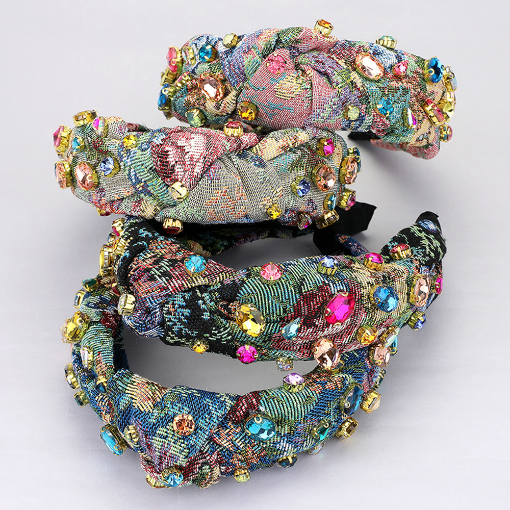 Details • Size : 1.75" H • Shine with elegance wearing this gem-embellished embroidered braided headband. Designed with intricate woven patterns and radiant embellishments, it adds a luxurious statement to any outfit, perfect for elevating casual ensembles or completing refined evening looks.