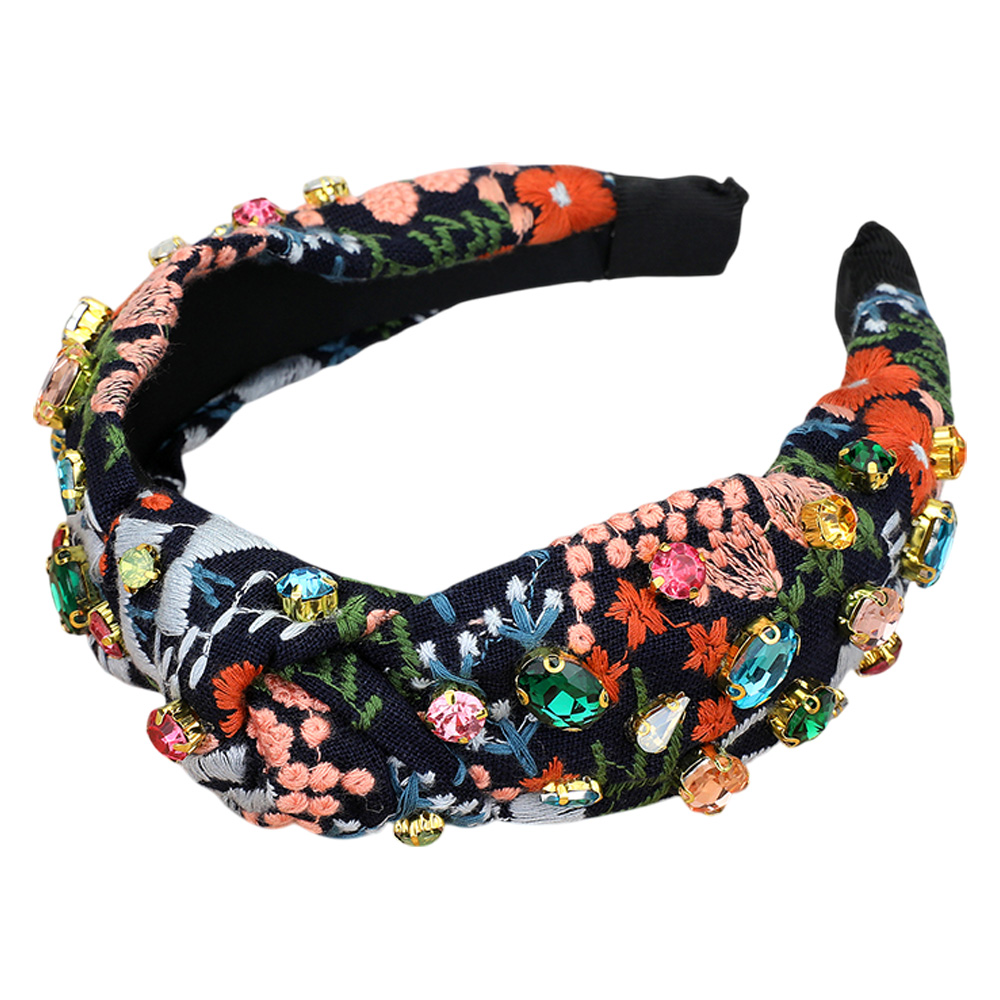 Flower Embroidered Stone Cluster Embellished Knot Headband