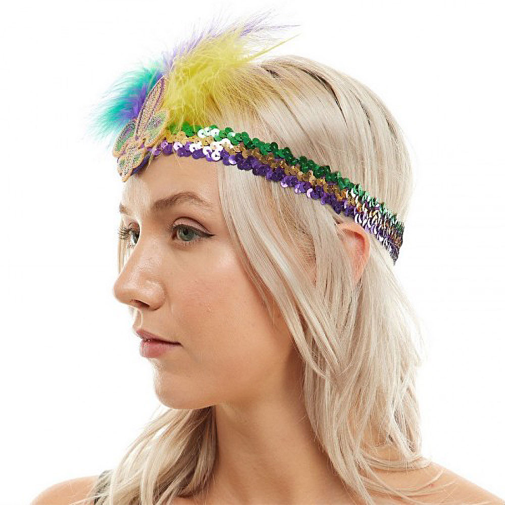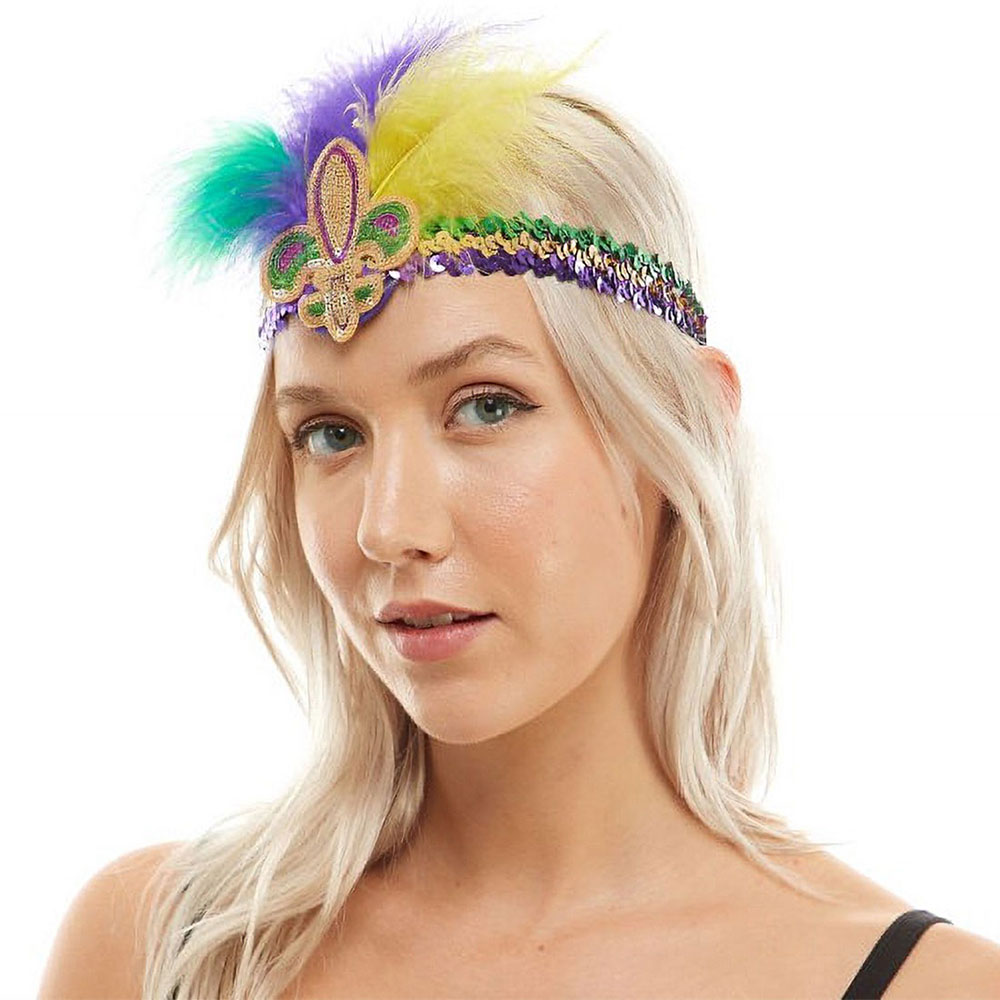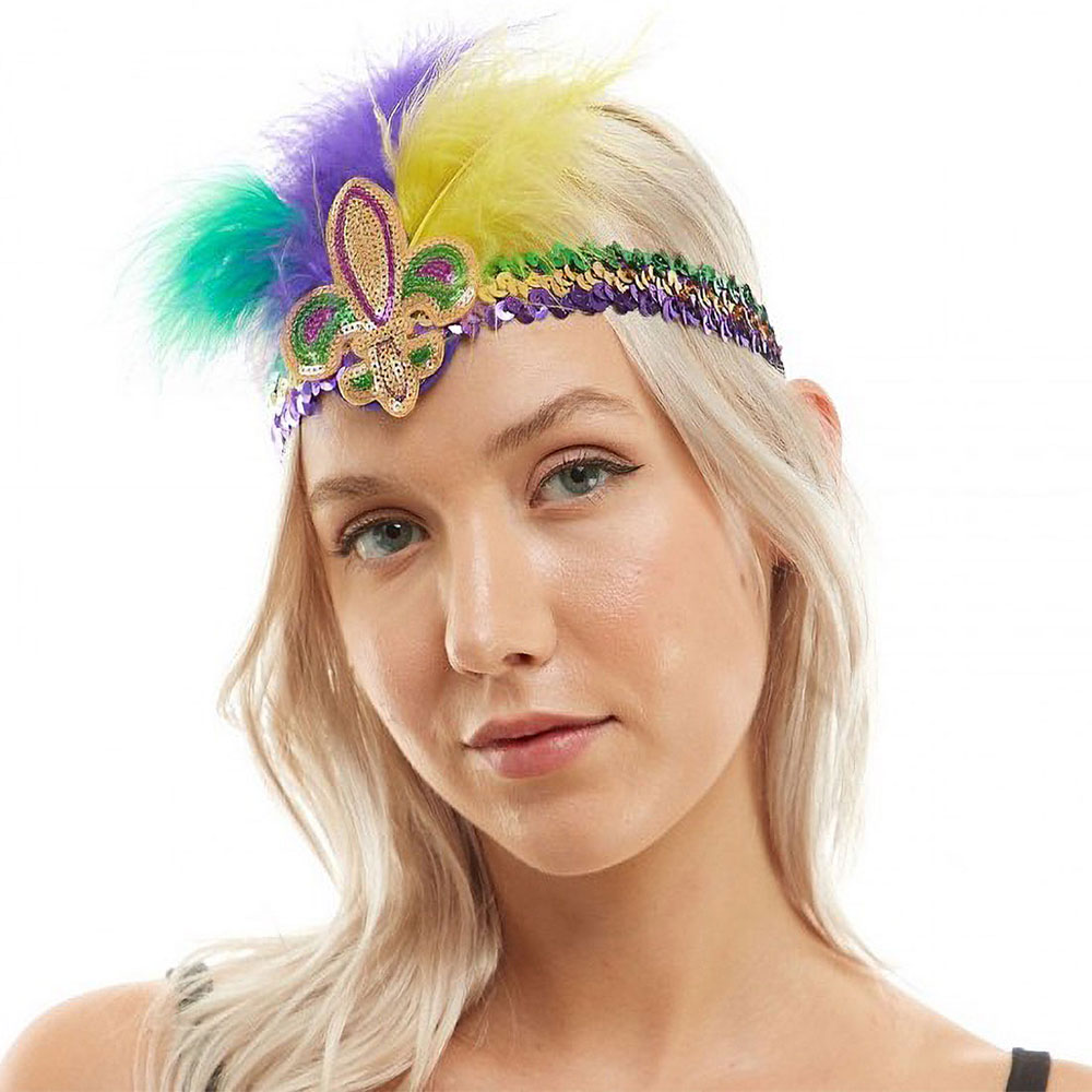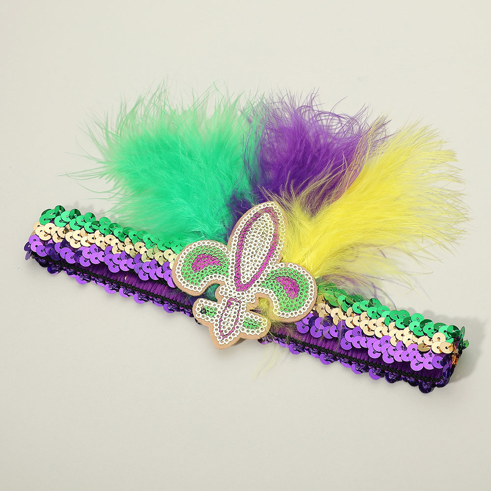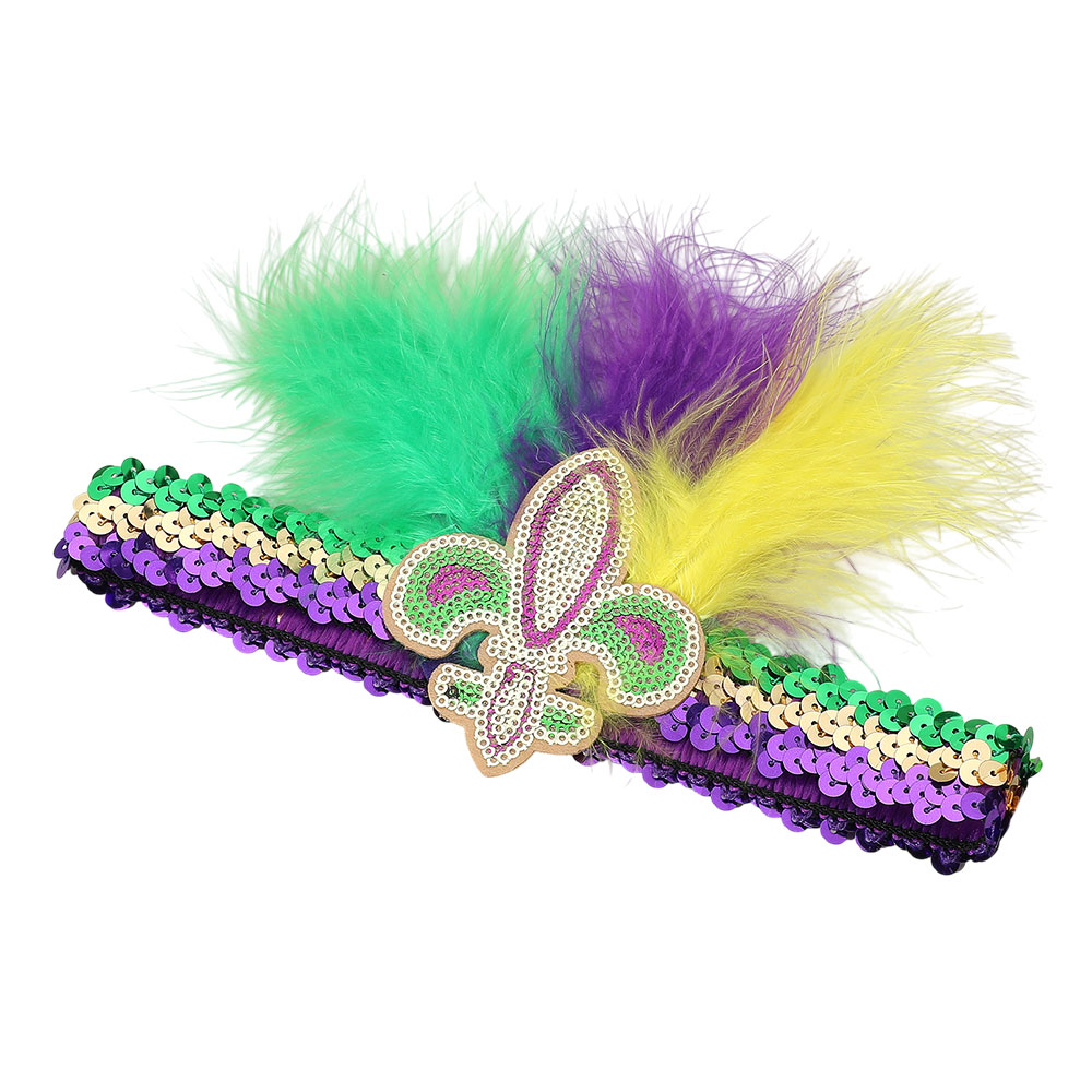 Details • Size : 6" h • Stretchable • Festive statement headband featuring a fleur-inspired centerpiece with feather detail and sequin band styling. Designed to elevate parade outfits, party looks, and themed celebrations with bold texture, comfortable wear, and eye-catching movement for all-day events.