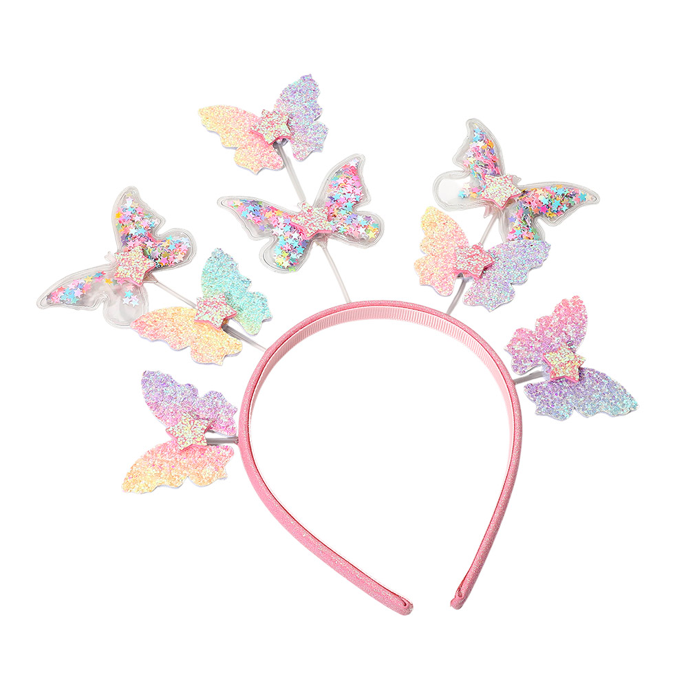 Details • Size : 5" H • Bring a whimsical touch to your look with this glitter butterfly headband adorned with fluttering butterfly shapes and sparkling star details. Lightweight and festive, it’s perfect for parties, photos, or playful events where you want to stand out with magical charm.