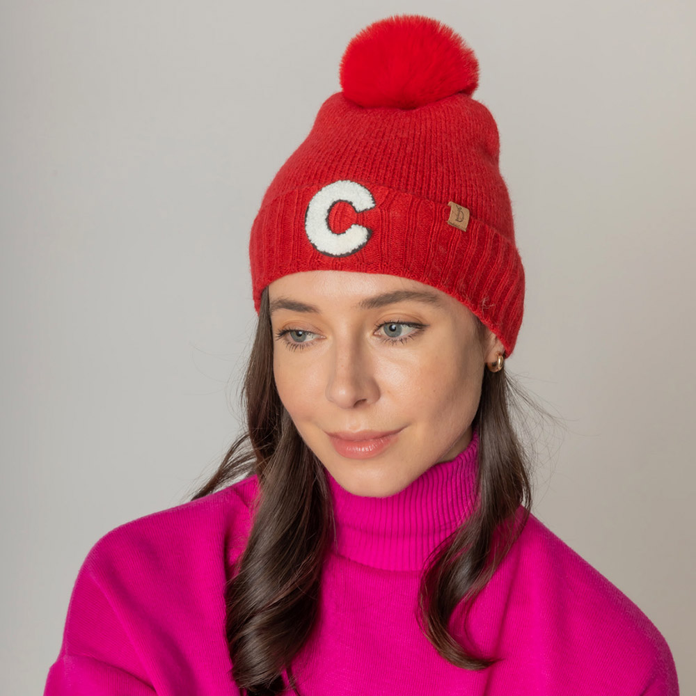 -C- Initial Monogram Faux Fur Pom Pom Knit Beanie Hat