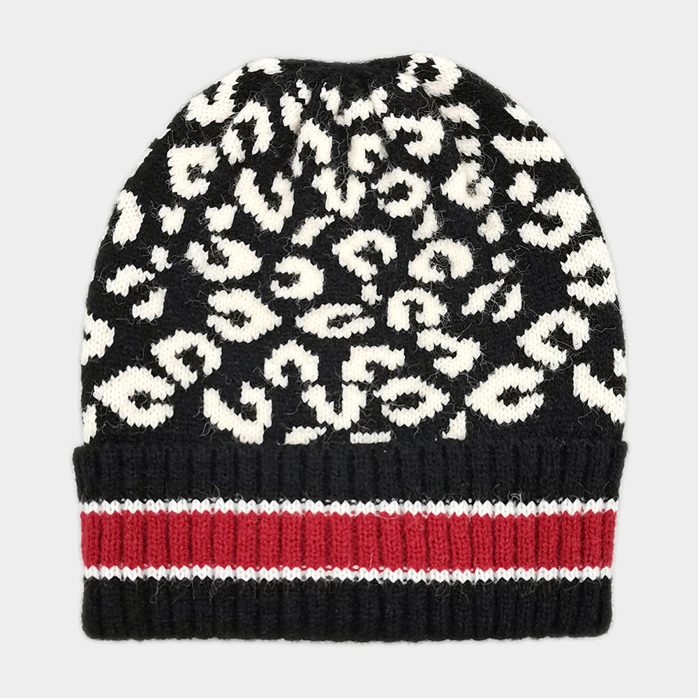 Leopard Patterned Striped Cuff Knit Beanie Hat