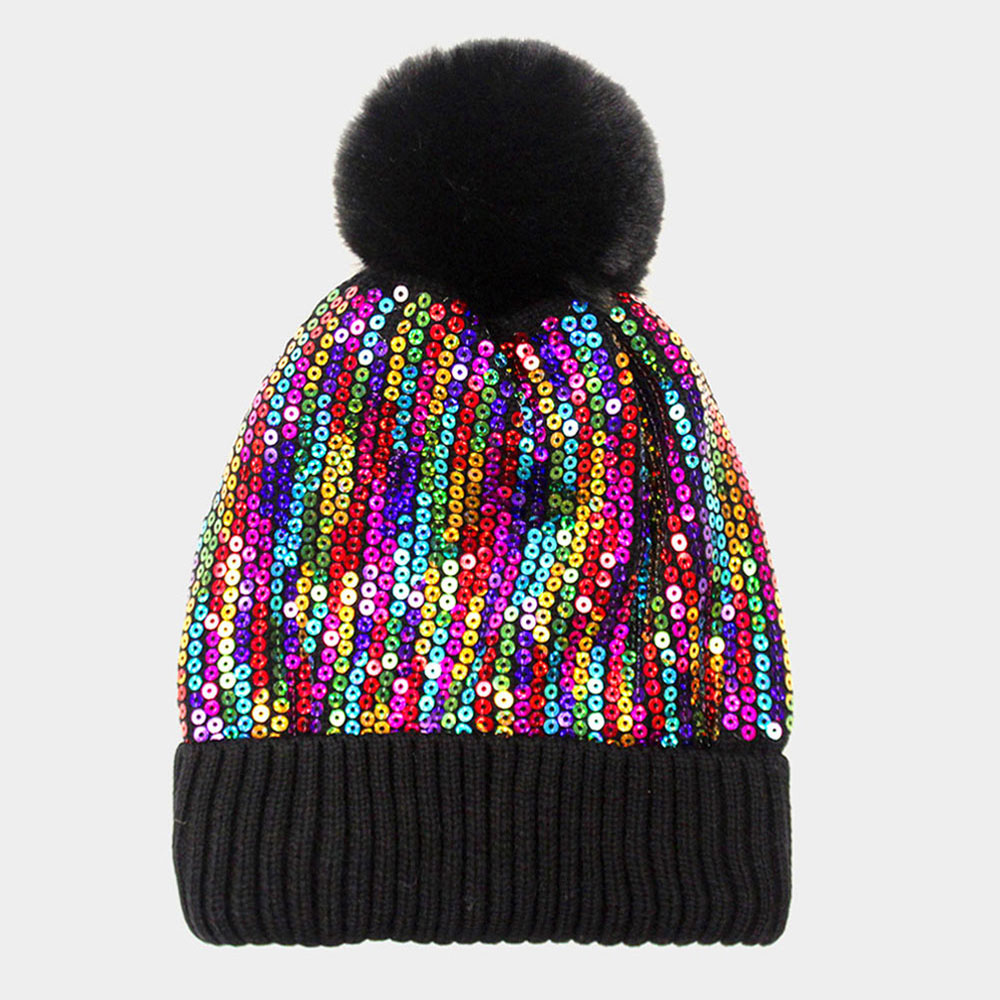 Sequin Embellished Pom Pom Beanie Hat