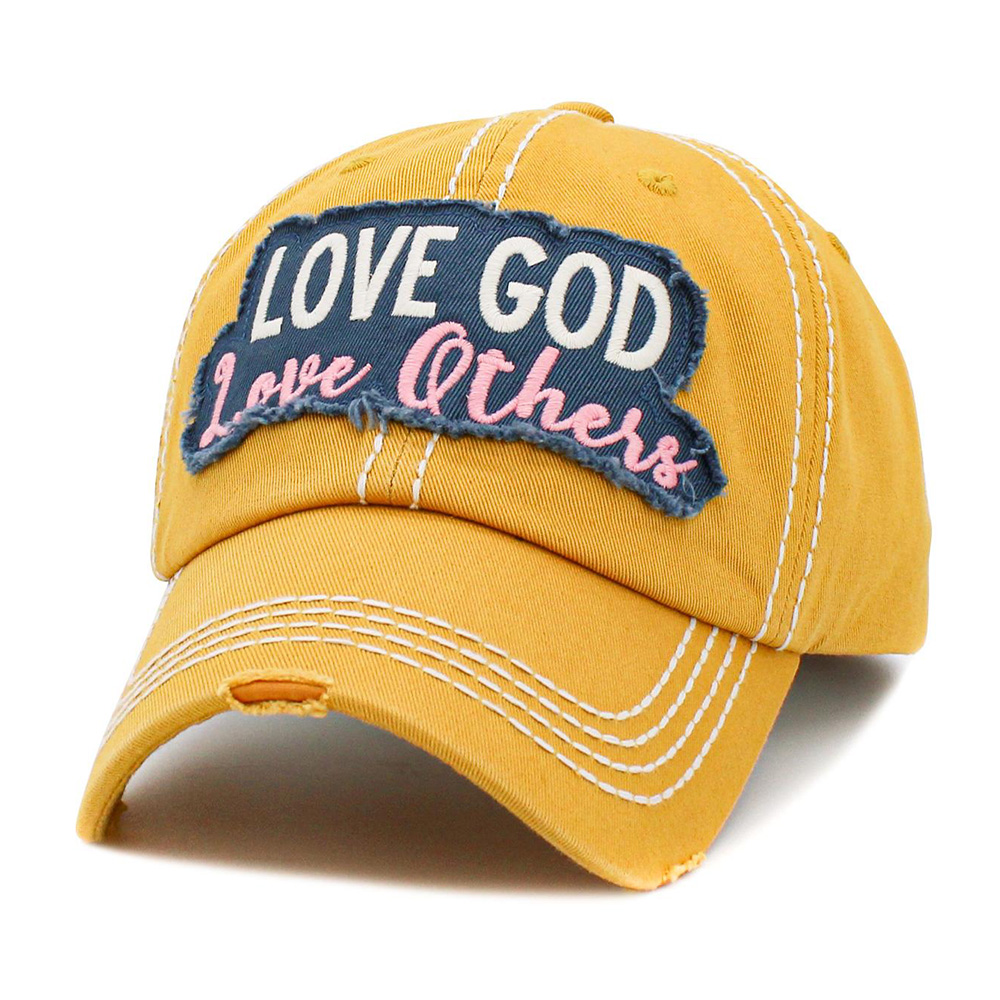 • Show faith and kindness with this distressed baseball cap featuring the inspirational phrase “Love God Love Others.” Stylish with contrast stitching and a comfortable fit, it’s the perfect everyday accessory to spread positivity and encouragement.