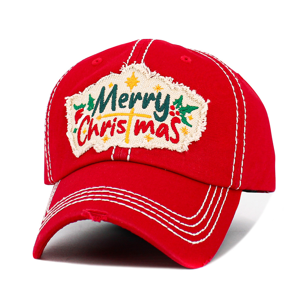 Details • Crown Circumference : 23" (Adjustable) • Crown Height : 4.5" • Brim Height : 3" • Material : 100% Cotton • Festive baseball cap featuring a bright “Merry Christmas” embroidered patch with a distressed edge for a cheerful holiday look. Ideal for casual wear or seasonal gatherings, this adjustable cap adds a fun and spirited touch to your winter wardrobe and festive celebrations.