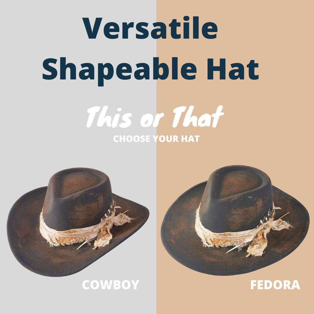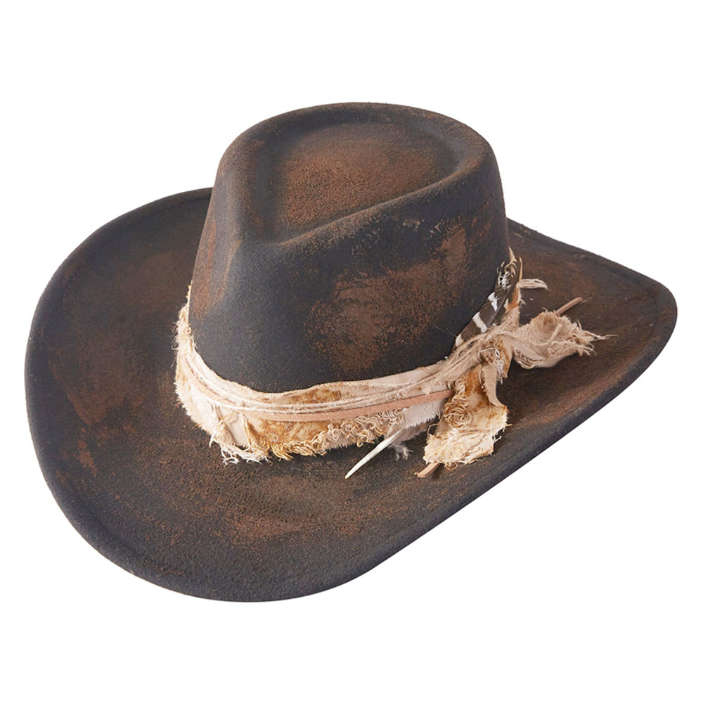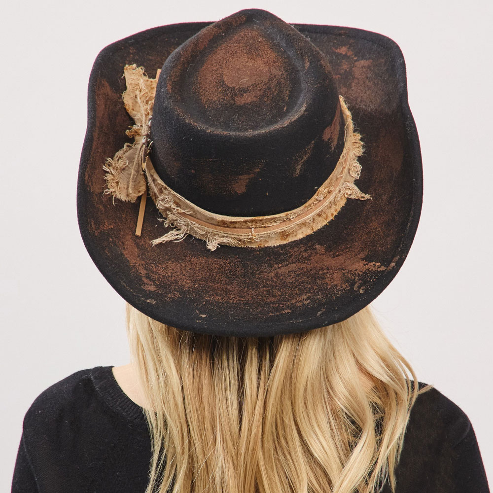 Details • Size : One Size • Material : 100% Polyester • Unique western hat with a weathered finish and layered fringe band. Perfect for rustic style lovers and themed events seeking an authentic, rugged fashion statement.