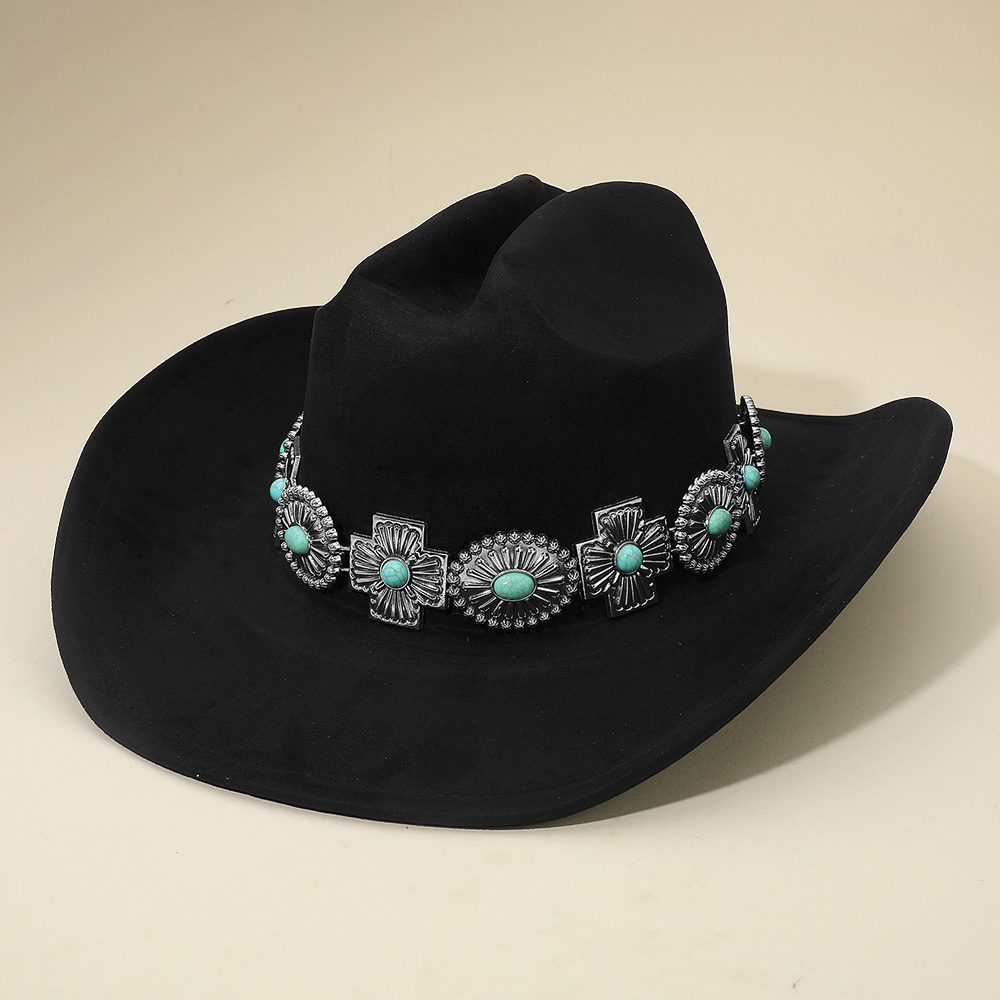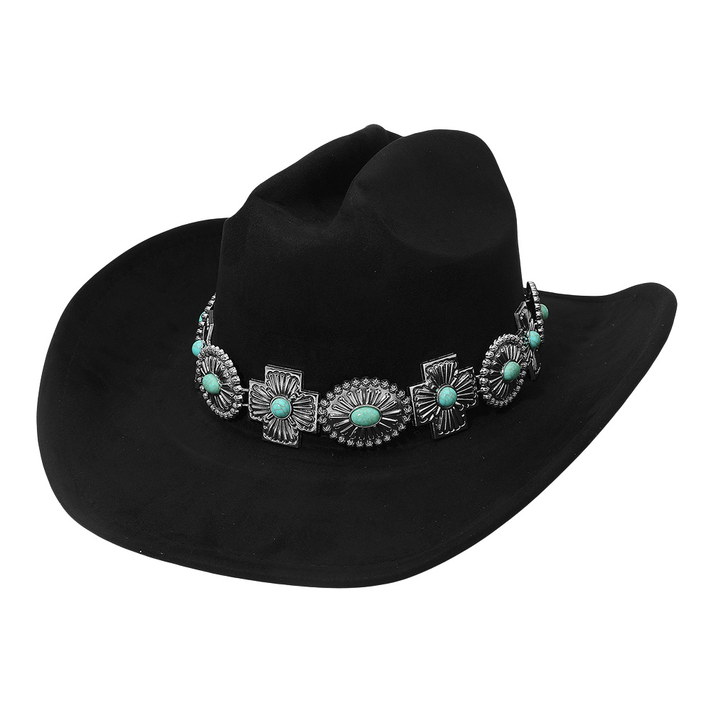 Details • Crown Circumference : 23" • Crown Height : 4.75" • Brim Height : 3.75" • Material : 100% Polyester • Classic western cowboy hat designed with a detailed concho band that adds bold character and unique flair. Perfect for festivals, rodeos, or casual style, this hat blends timeless tradition with standout fashion appeal, making it a versatile accessory for any western-inspired look.