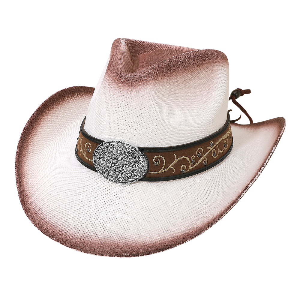 Details • Crown Circumference : 23" • Crown Height : 4.75" • Brim Height : 3.75" • Material : 98% Rayon, 2% Polyester • Capture authentic western style with this cowboy hat featuring a tooled band and ornate silver concho. Perfect for rodeos, concerts, or casual outings, it blends rugged tradition with refined details, making it a versatile accessory for any cowboy-inspired look.