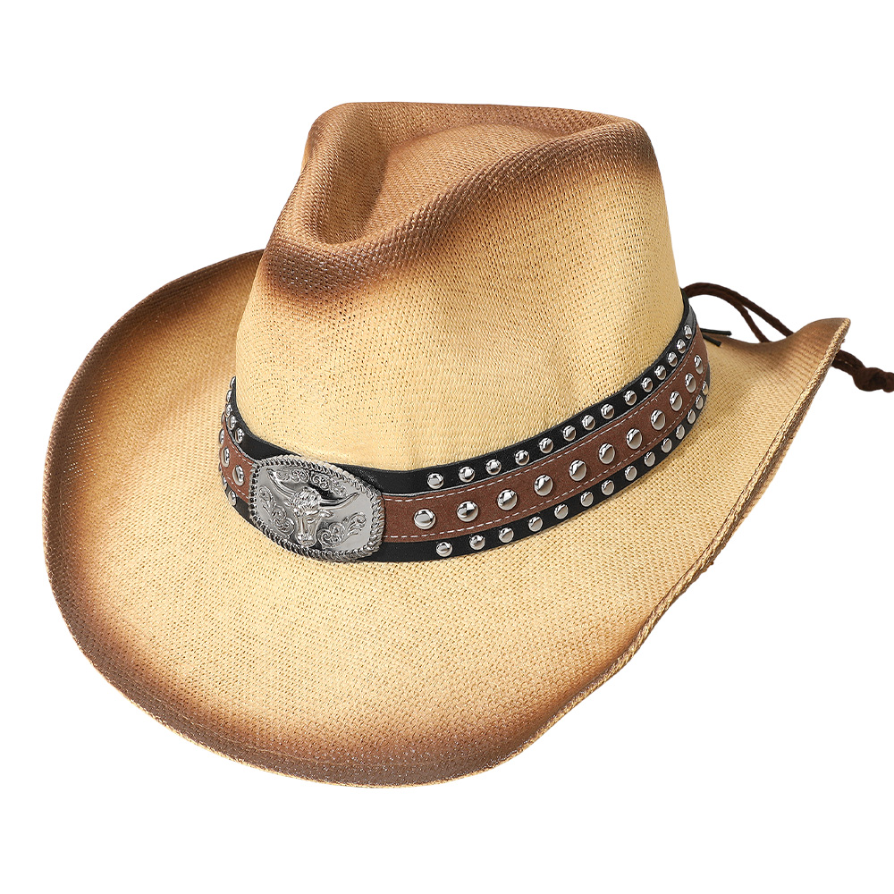 • Command attention with this cowboy hat featuring a studded band and bold steer head concho centerpiece. Perfect for rodeos, concerts, or casual wear, it captures rugged western spirit with striking detail, making it a must-have accessory for adventurous style.