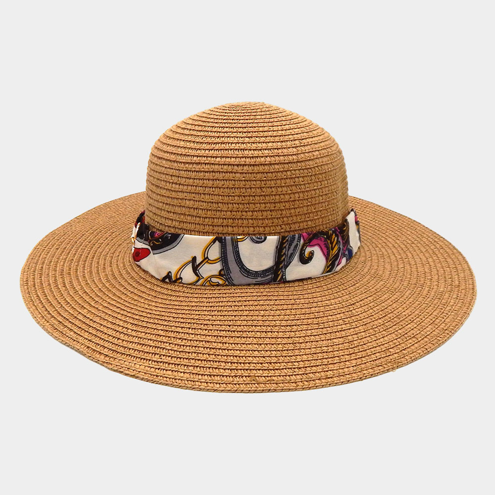 Wide Brim Chain Printed Silk Like Fabric Band Straw Hat