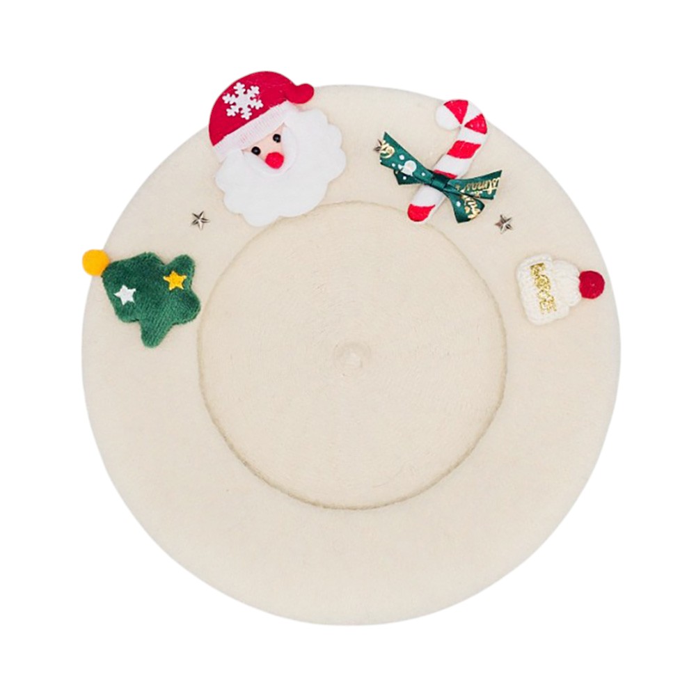 Details • Size : 10.5" X 10.5" • Festive Christmas beret hat featuring a cheerful Santa design, candy cane, and holiday-themed details. A playful accessory perfect for parties, gatherings, and seasonal outfits. Add charm and holiday cheer to your winter look with this fun Christmas hat, ideal for gifting or festive celebrations.