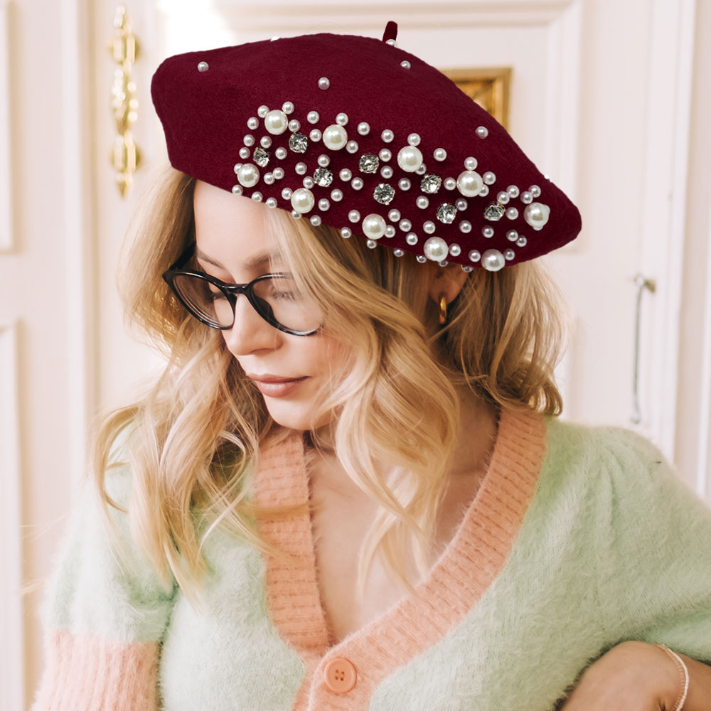Details • Size : One Size • Material : 80% Wool, 20% Acrylic • Chic beret hat adorned with pearl embellishments for a stylish and elegant look. Perfect for elevating seasonal outfits, this accessory adds a touch of sophistication and charm, making it a fashionable addition to both casual and dressy wardrobes.