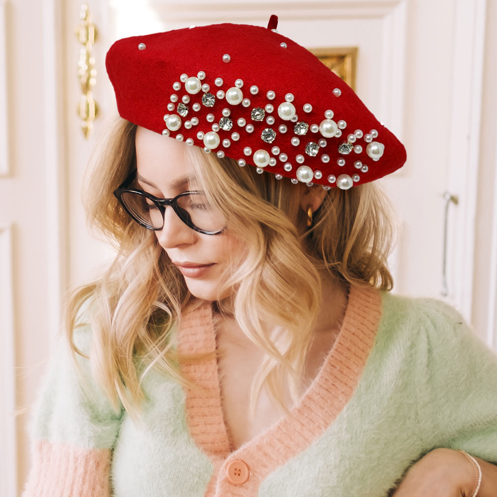 Details • Size : One Size • Material : 80% Wool, 20% Acrylic • Chic beret hat adorned with pearl embellishments for a stylish and elegant look. Perfect for elevating seasonal outfits, this accessory adds a touch of sophistication and charm, making it a fashionable addition to both casual and dressy wardrobes.