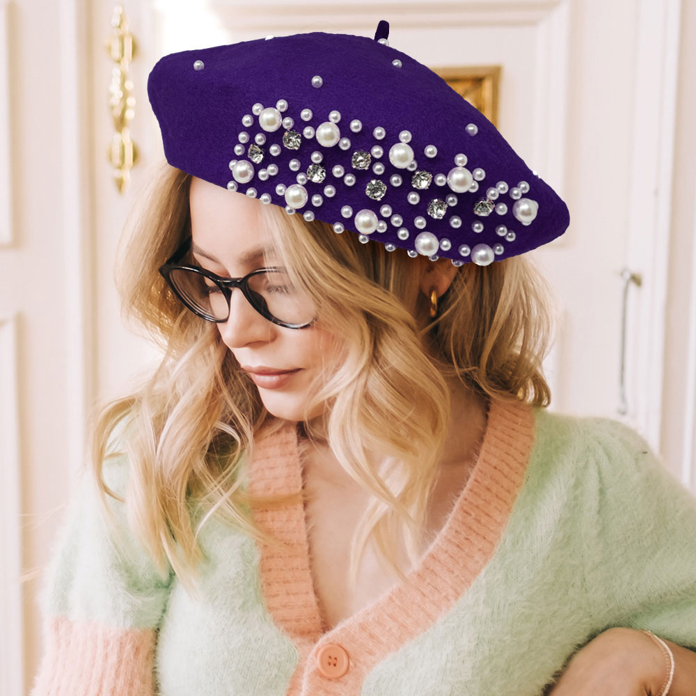 Pearl Stone Embellished Wool Blend Beret Hat Pearl Stone Embellished Wool Blend Beret Hat