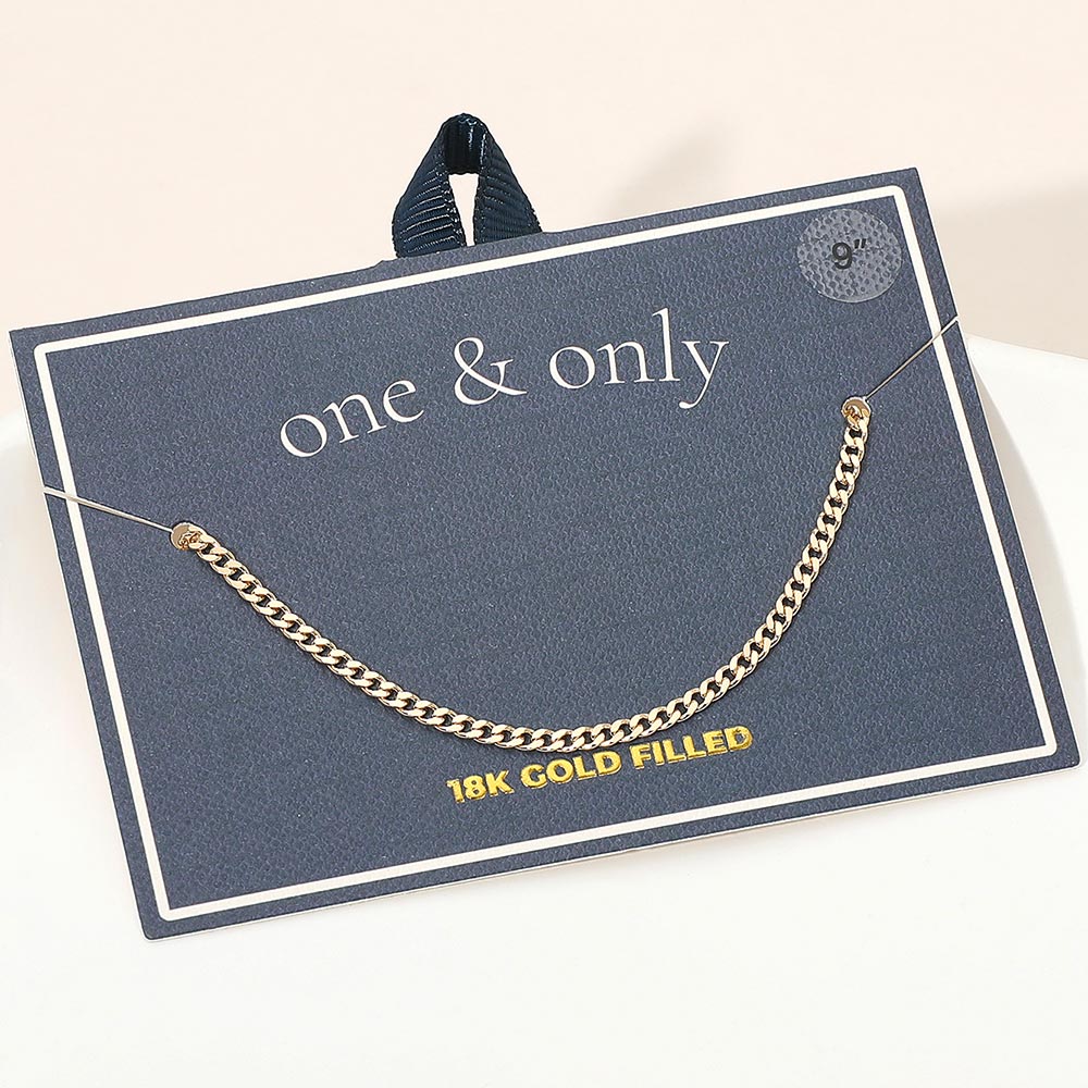 Details • Size : 0.1" H (2mm), 9" L • Lobster Clasp • Timeless Cuban chain anklet featuring smooth flat links with a sleek polished shine. Its classic design offers effortless sophistication, perfect for daily wear or layering with other pieces. A versatile accessory that adds a refined touch to any modern or classic look. • Gold Filled • Lead and Nickel Compliant • Made In Brazil
