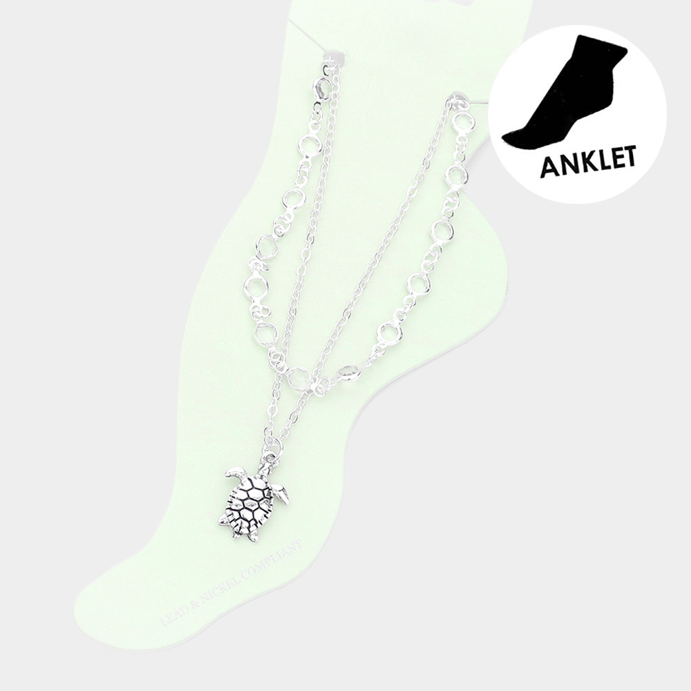 Metal Turtle Charm Round Bead Link Double Layered Anklet