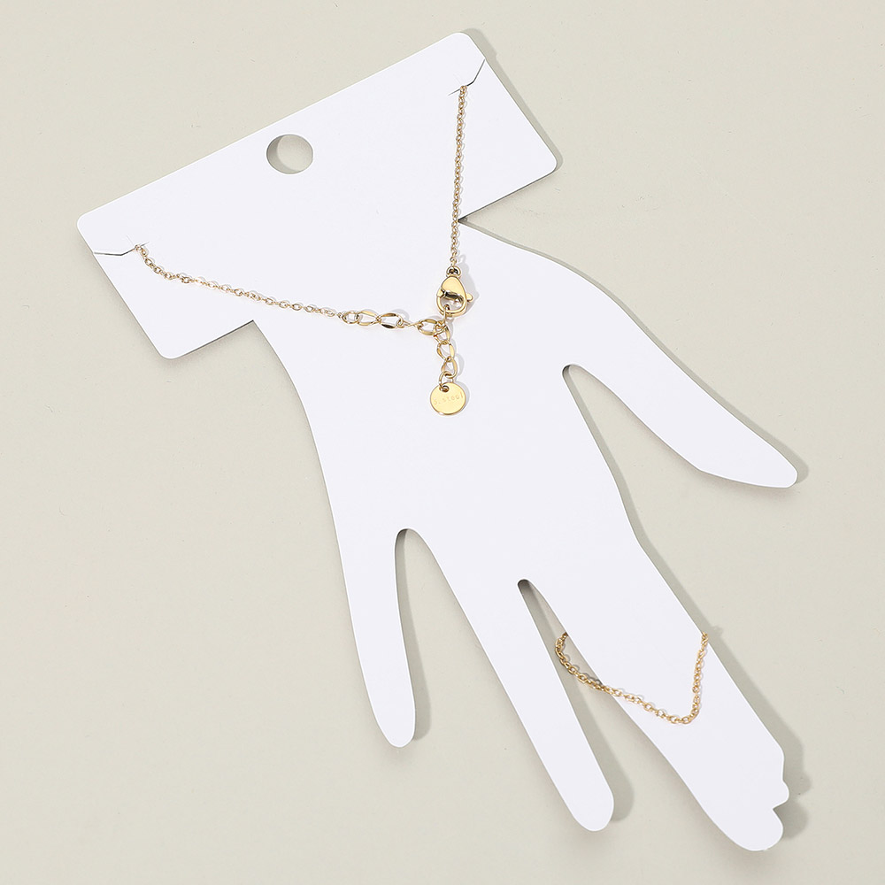 Details • Size : 3.75" H, 6.75" + 1" L • Ring Size : Free • Stylish hand chain bracelet featuring a delicate linked design that drapes gracefully from wrist to finger. Lightweight and refined, it adds a touch of elegance to everyday looks or special occasions. A chic accessory that highlights your personal style with subtle sparkle. • Stainless Steel