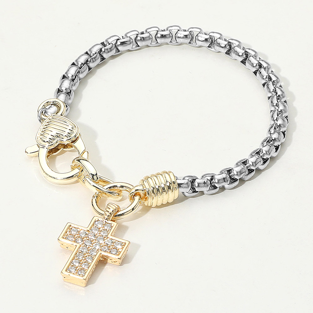 14K Gold Plated CZ Stone Paved Cross Charm Two Tone Bracelet