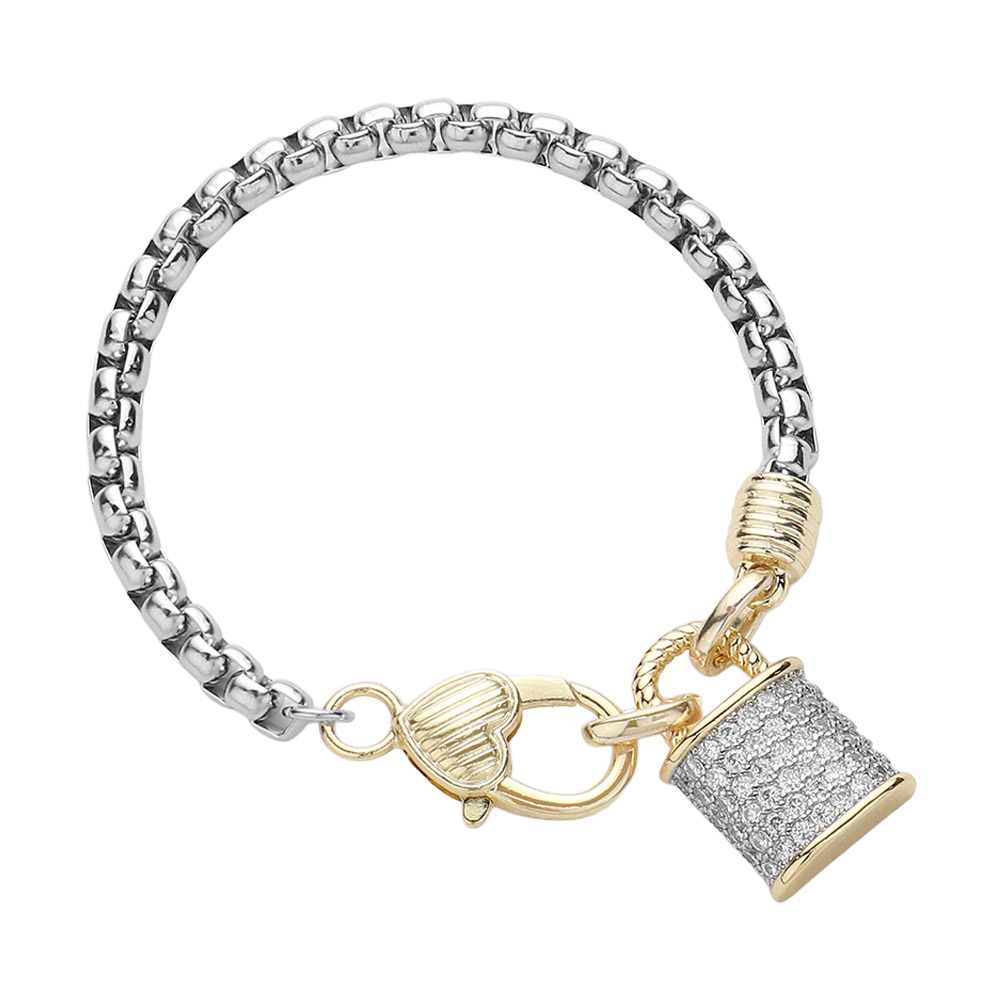 14K Gold Plated Two Tone CZ Stone Paved Lock Charm Pointed Bracelet