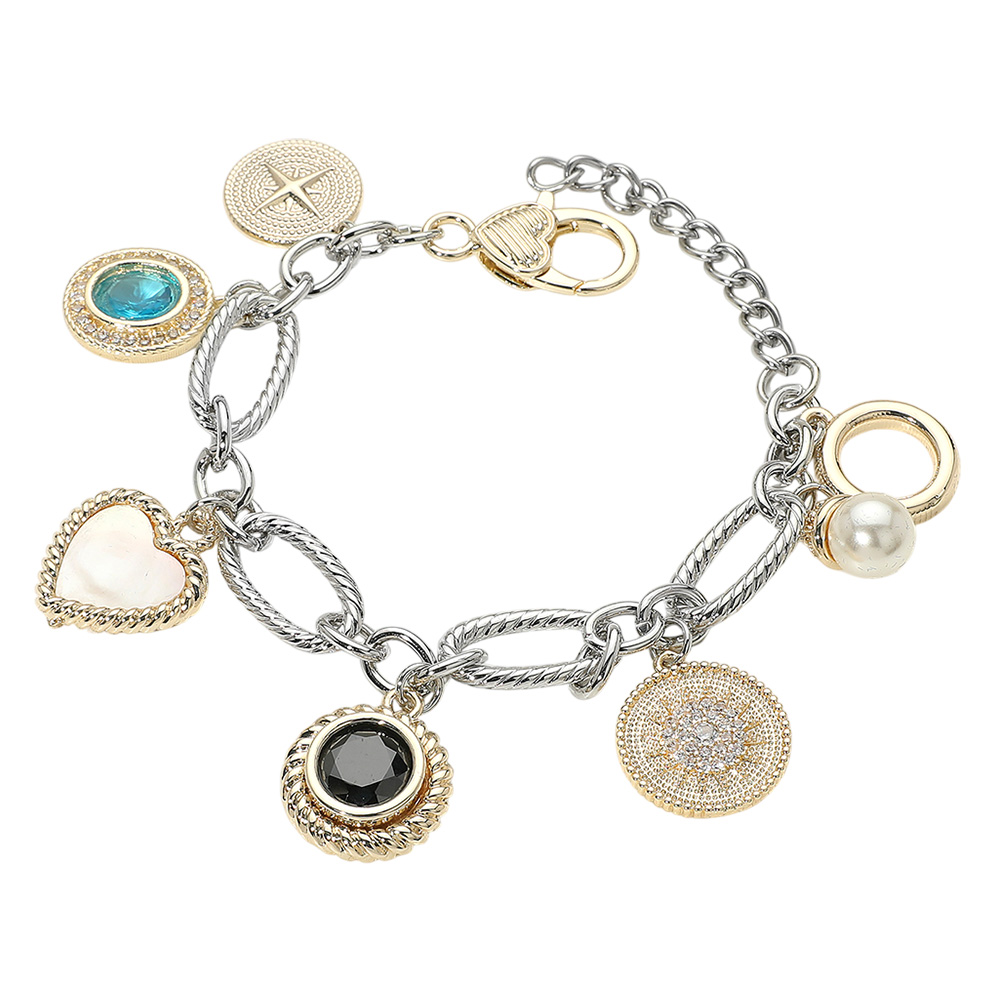 14K Gold Plated Two Tone Mother of Pearl Heart Pearl Color CZ Stone Charm Station Bracelet