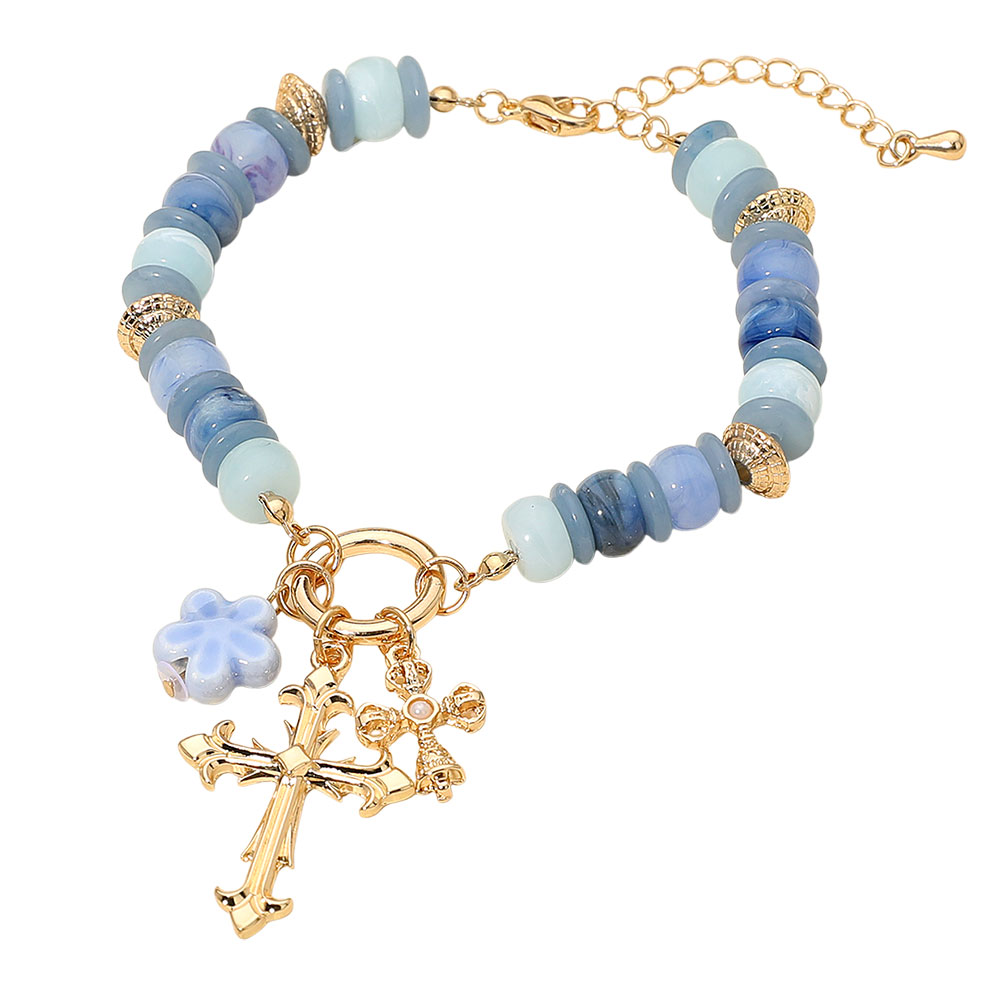 Cross Ceramic Floral Charm Resin Disc Beaded Bracelet Cross Ceramic Floral Charm Resin Disc Beaded Bracelet