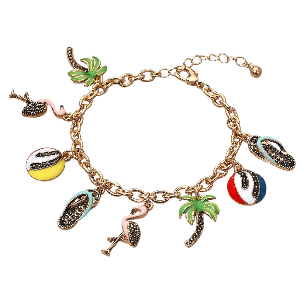 Details • Size : 0.2" H, 7.75" + 1.75" L • Charm Size : 1" L • Lobster Clasp Closure • Playful tropical charm bracelet featuring flamingos, palm trees, flip flops, and colorful beach ball accents. A vibrant accessory that captures the essence of summer vacations, perfect for adding a fun and lively touch to casual outfits or gifting to beach lovers. • Lead and Nickel Compliant