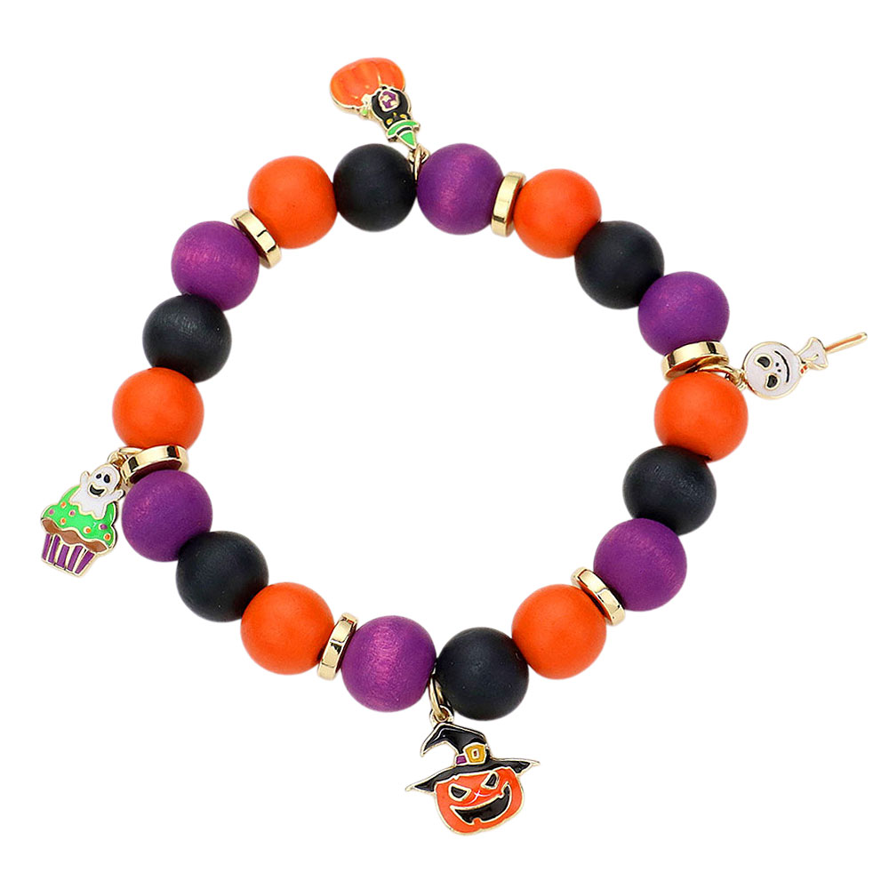 Details • Size : 0.8" H • Stretchable • Playful Halloween stretch bracelet with bold beads in festive shades, decorated with spooky charms like pumpkin, ghost, and witch. A fun seasonal accessory perfect for parties and trick-or-treat style. • Lead and Nickel Compliant