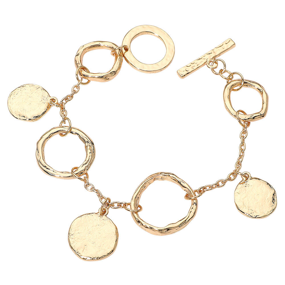 Details • Size : 1" H, 8" L • Toggle Closure • Statement charm bracelet featuring linked circular elements and softly textured drop accents for a modern, eye-catching look. Designed to move with every gesture, it layers easily with other accessories or shines as a bold solo piece. • Lead and Nickel Compliant
