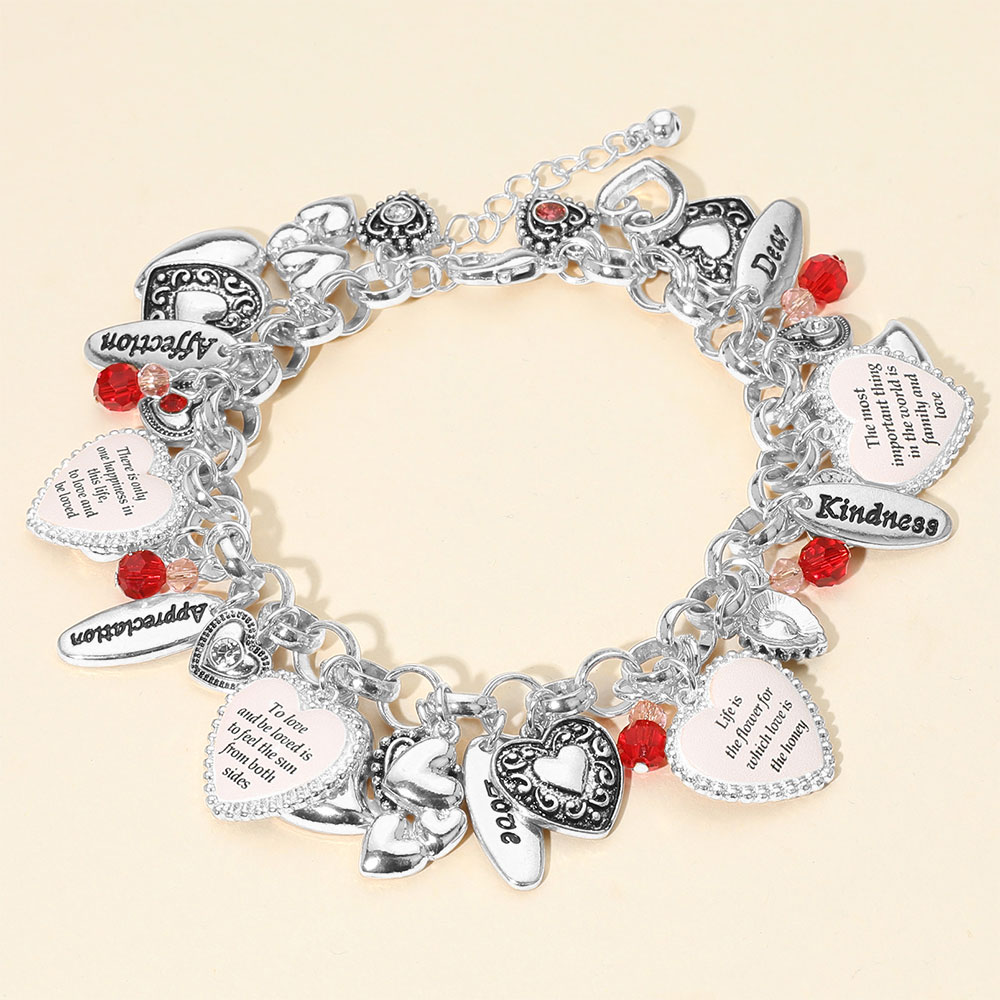 Details • Size : 1" H, 8" + 2" L • Lobster Clasp Closure • Celebrate love and positivity with this heart charm bracelet featuring engraved inspirational words and decorative accents. A meaningful jewelry piece designed to uplift your spirit while adding a unique, eye-catching detail to everyday outfits and special occasions. • Lead and Nickel Compliant