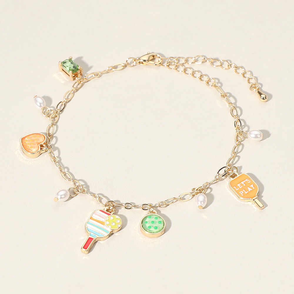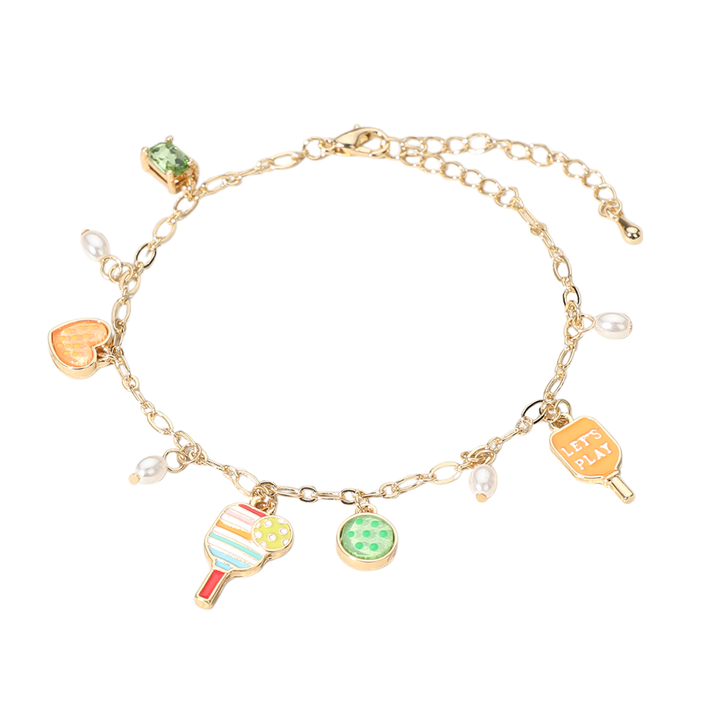 Details • Size : 0.8" H, 7" + 2.2" L • Lobster Clasp Closure • Delicate charm bracelet featuring playful pendants including heart, paddle, ball, and “Let’s Play” accent. Adjustable chain for a comfortable fit. A fun and stylish accessory for casual wear, gifts, or themed outfits. • Lead and Nickel Compliant