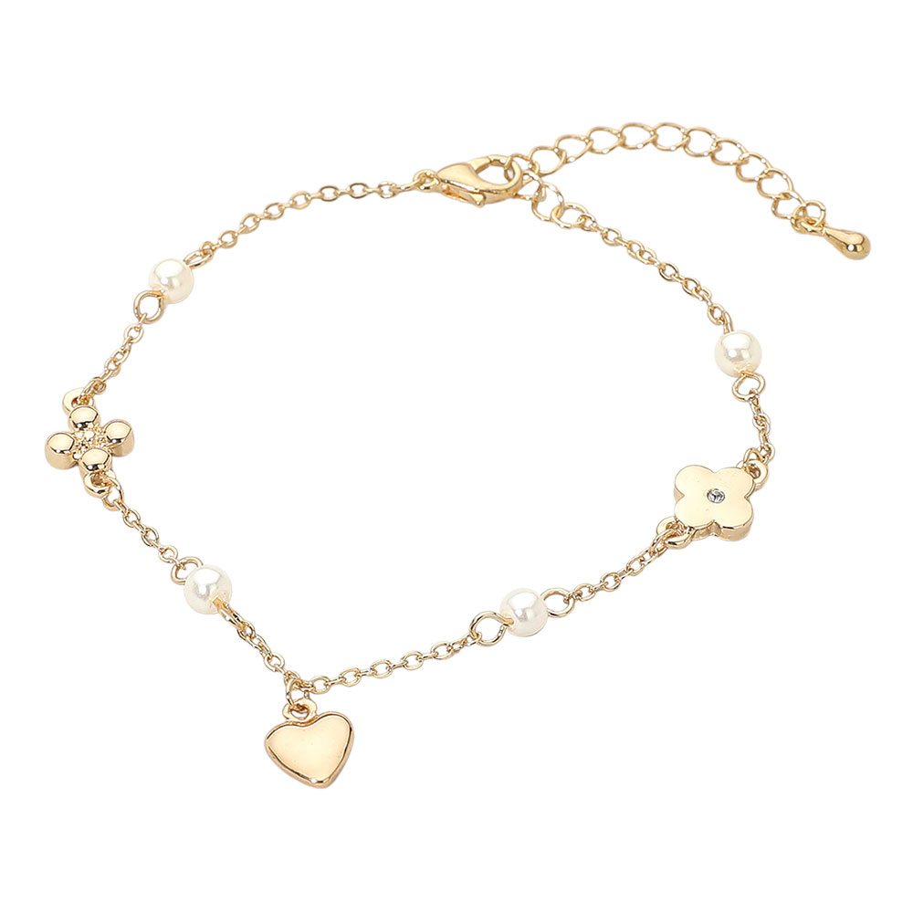 Details • Size : 0.1" H, 7" + 1.5" L • Charm Size : 0.3" L • Lobster Clasp Closure • This elegant charm bracelet features dainty heart and flower pendants paired with pearl accents for a refined, romantic touch. The adjustable chain offers a comfortable fit, making it an effortlessly chic accessory for both everyday wear and special occasions. • Lead and Nickel Compliant