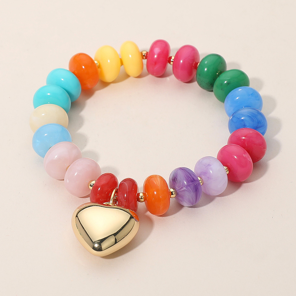 Metal Heart Charm Accent Resin Pebble Beaded Stretch Bracelet