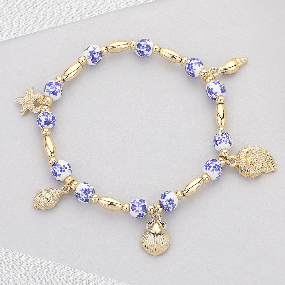Metal Shell Puka Shell Starfish Charm Station Ceramic Ball Beaded Stretch Bracelet
