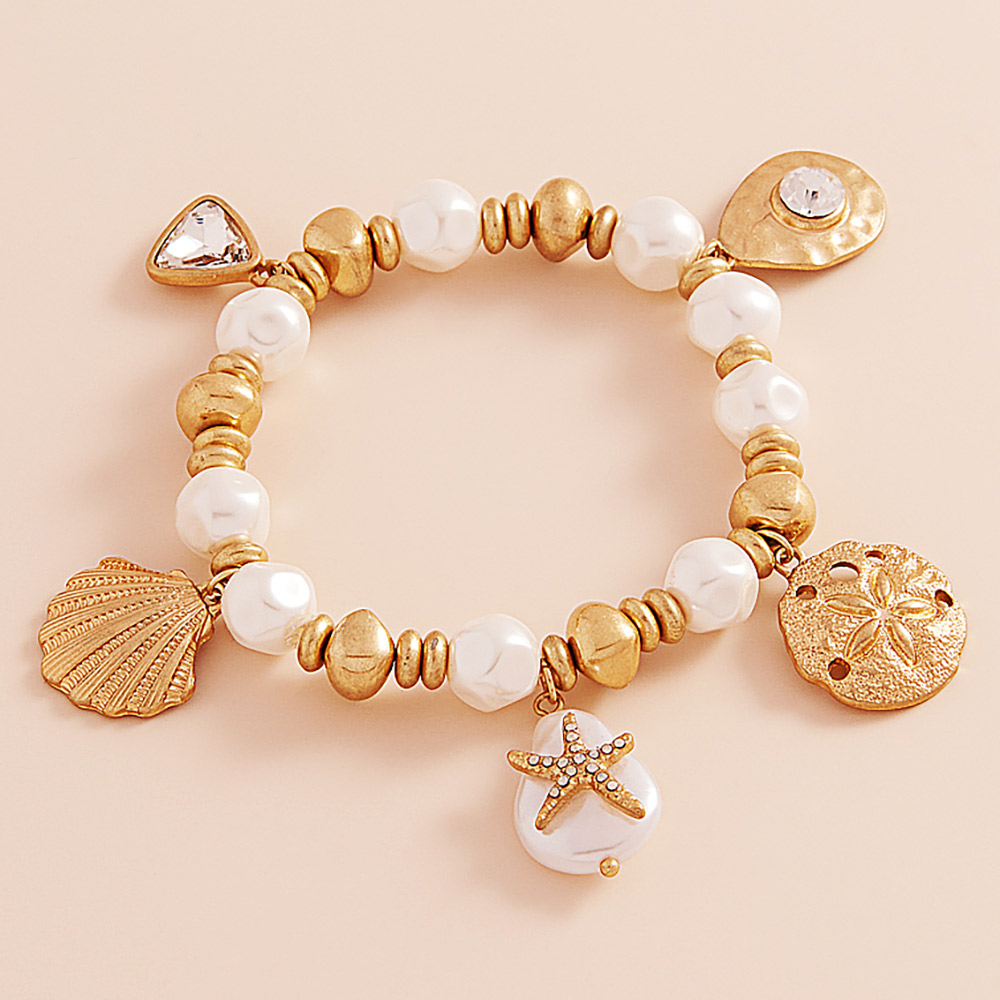 Metal Shell Sand Dollar Pearl Starfish Charm Pearl Beaded Stretch Bracelet