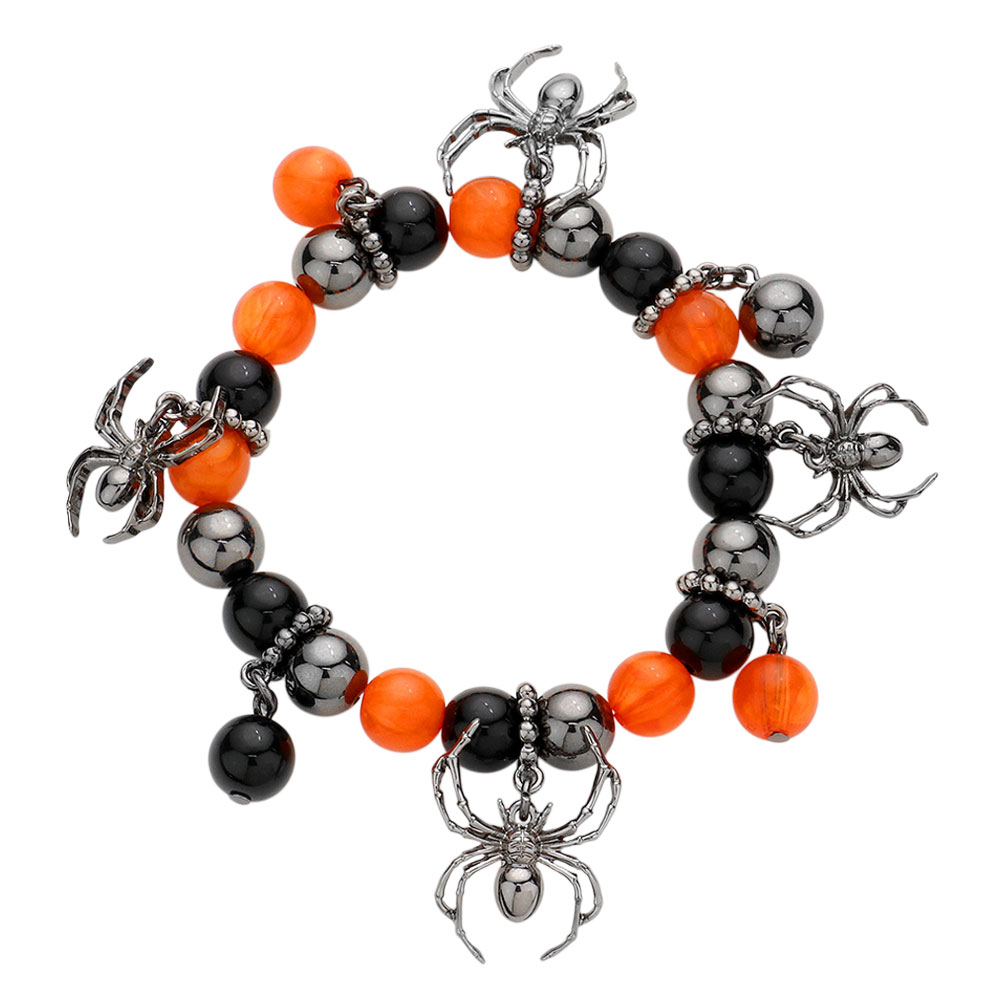 Details • Size : 1.25" H • Stretchable • Spooky Halloween beaded bracelet featuring black and orange beads with detailed spider charms. A fun and festive accessory perfect for costumes, parties, or adding a playful touch to your Halloween look. • Lead and Nickel Compliant