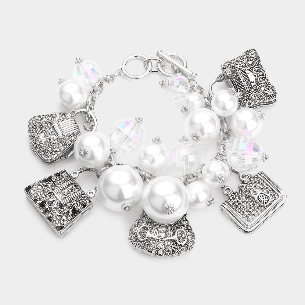 Metal Tote Bag Charm Station Pearl Cluster Toggle Bracelet
