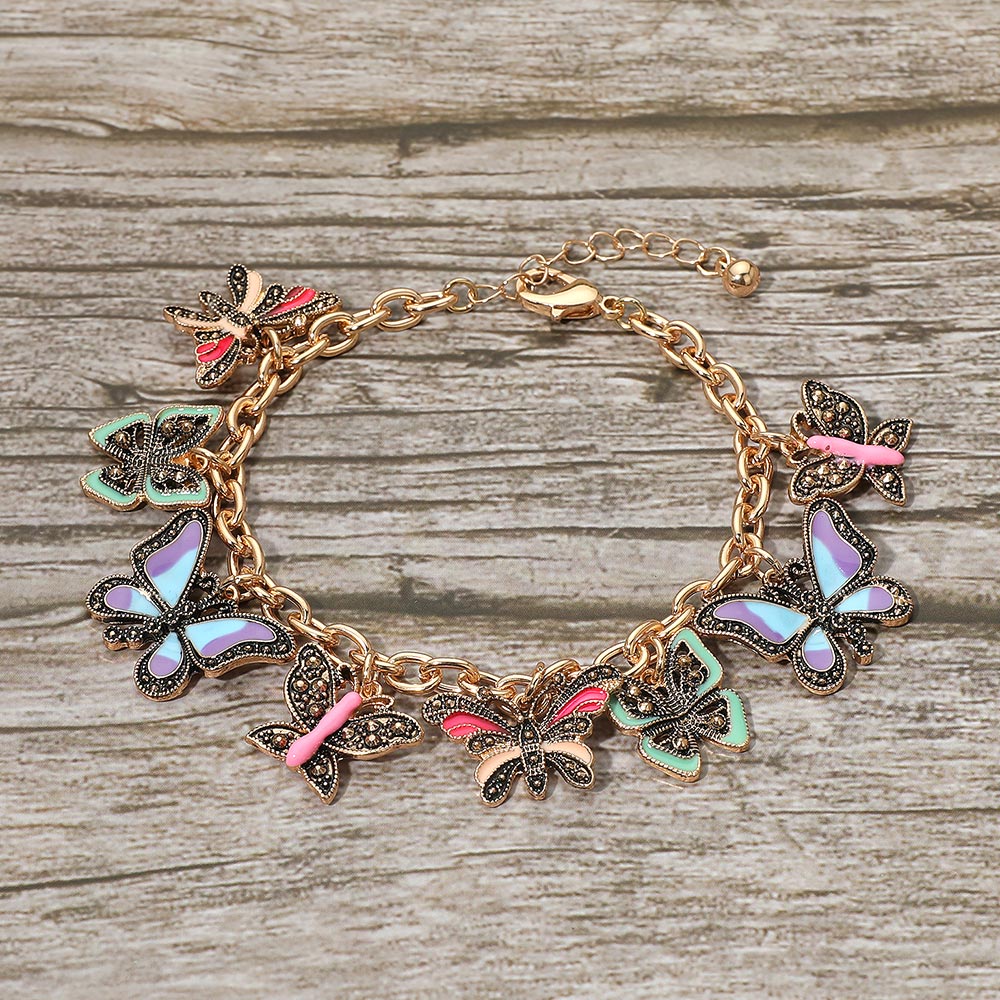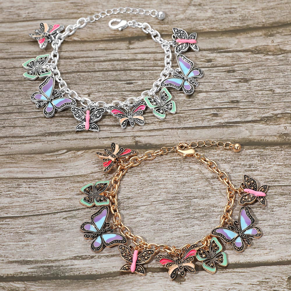 Details • Size : 0.2" H, 7.75" + 1.75" L • Charm Size : 0.75" L • Lobster Clasp Closure • Charming butterfly bracelet featuring multiple pendants with colorful accents and intricate detailing. A whimsical accessory that adds elegance and playful beauty to any outfit, perfect for nature lovers and those who enjoy unique jewelry with a touch of personality and vibrant flair. • Lead and Nickel Compliant