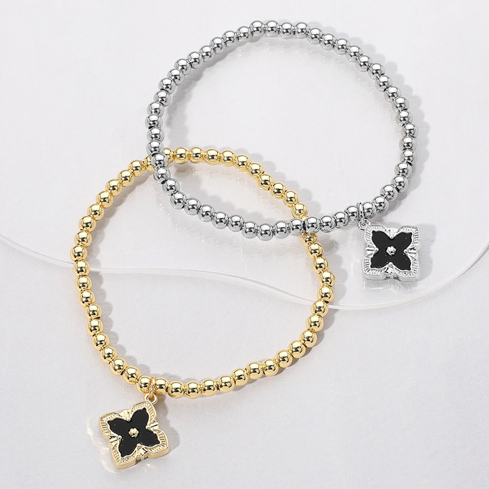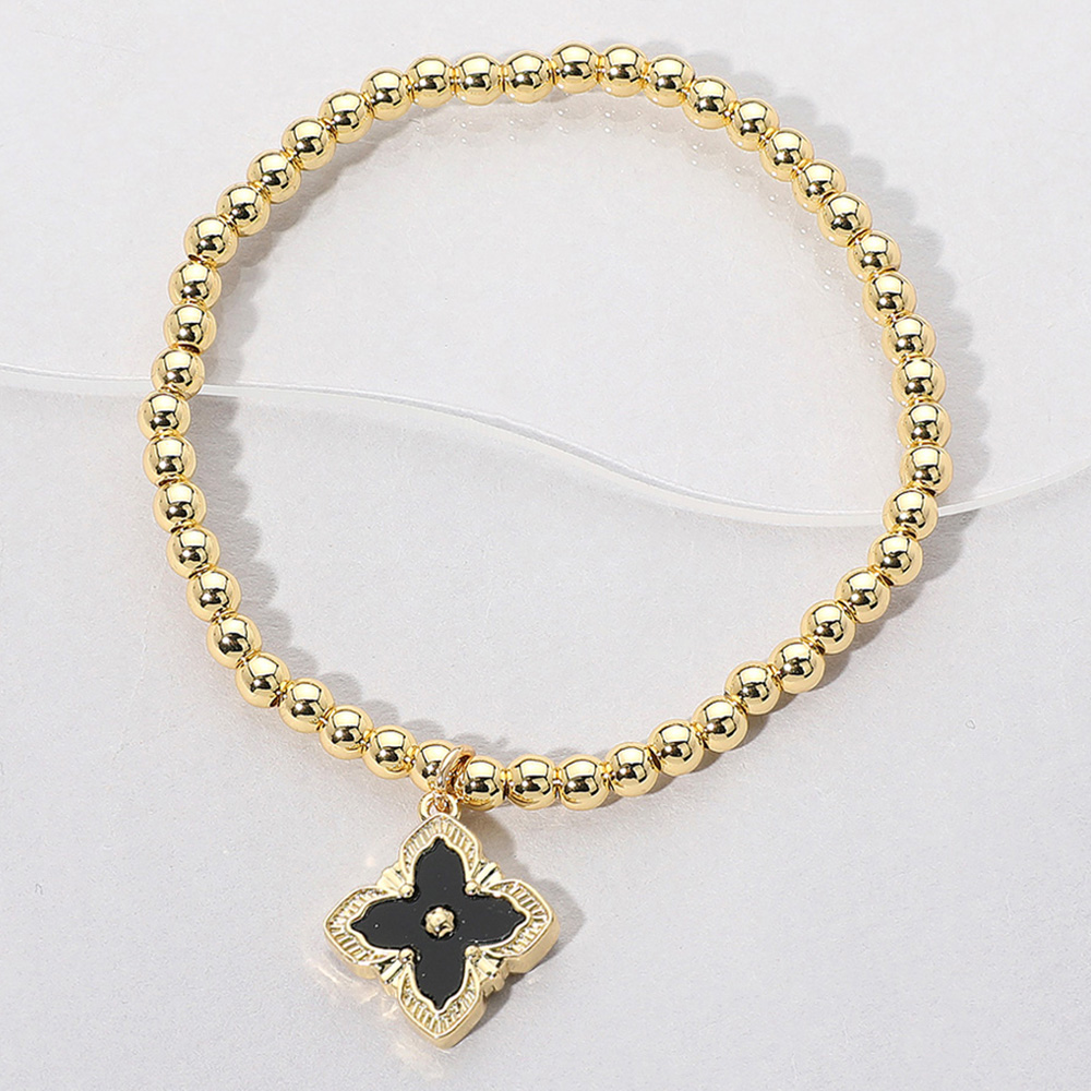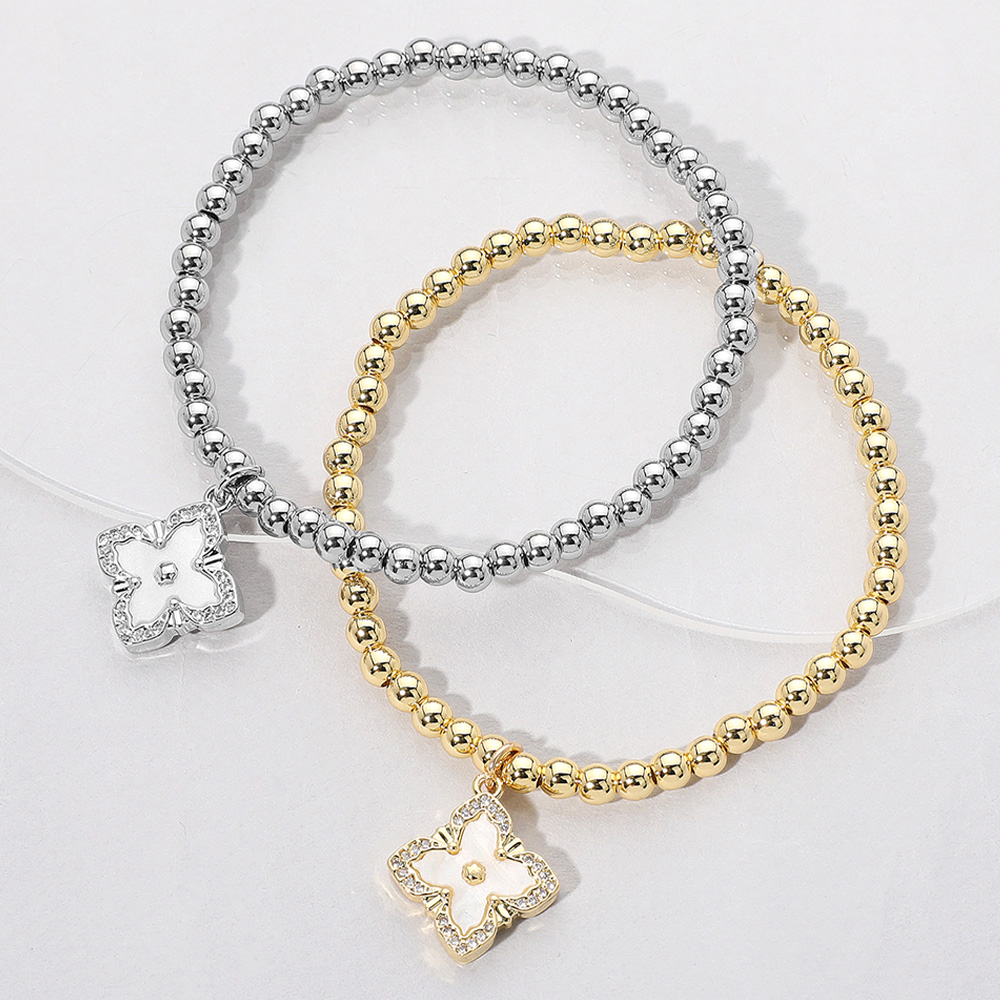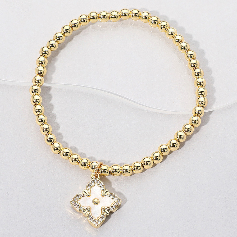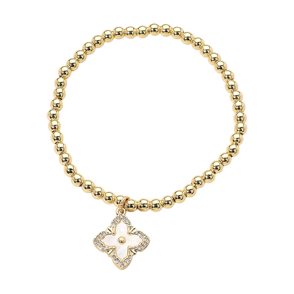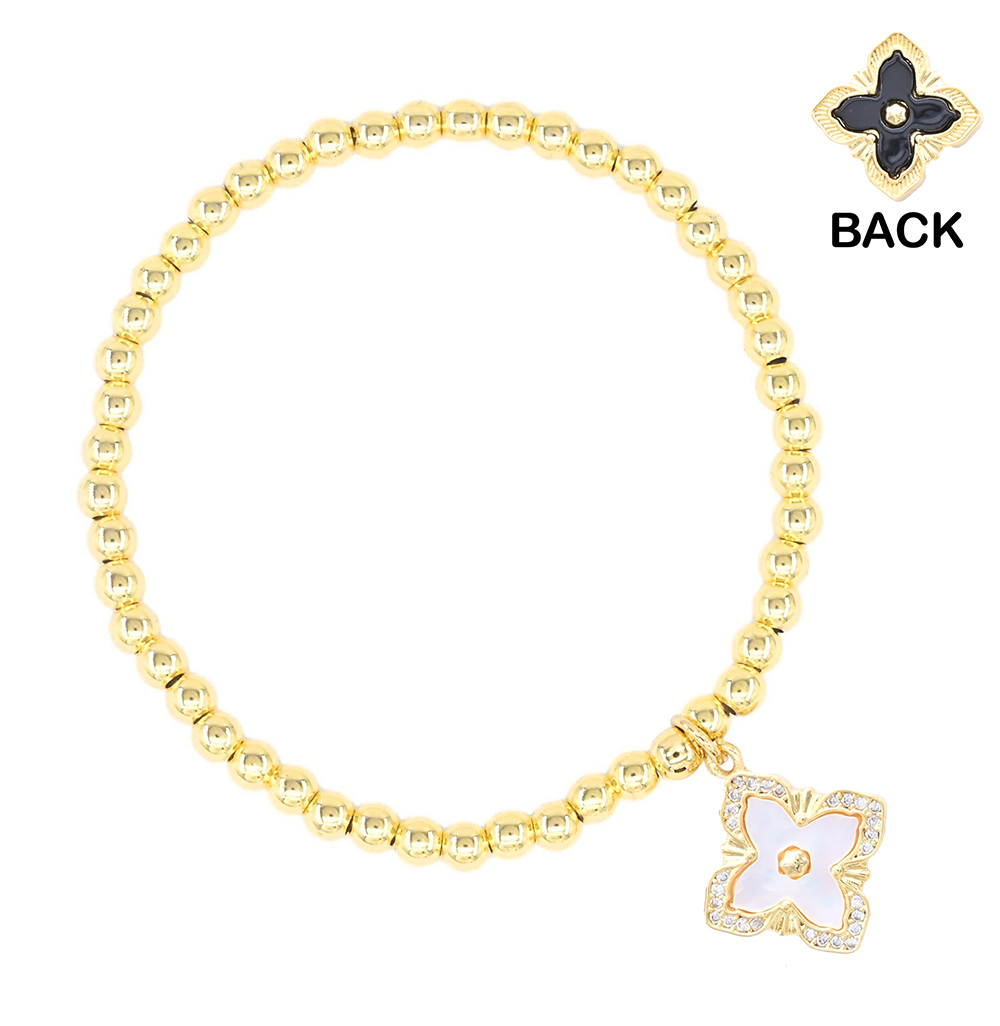 Reversible Stainless Steel Mother of Pearl Clover Charm Beaded Stretch Bracelet