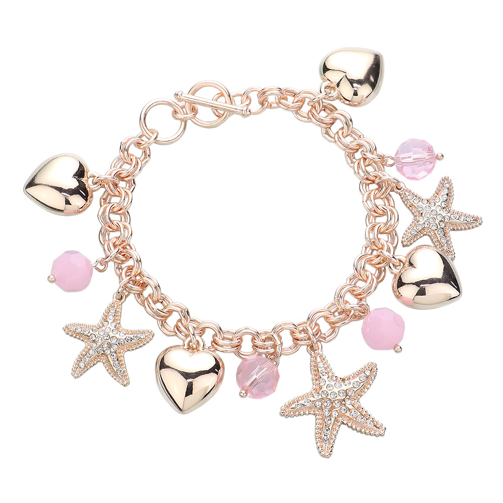 Details • Size : 1.25" H, 7.5" + 0.5" L • Toggle Closure • Stylish charm bracelet featuring starfish, heart, and bead charms. A beach-inspired design perfect for adding a playful, elegant touch to your accessory collection or gift list. • Lead and Nickel Compliant
