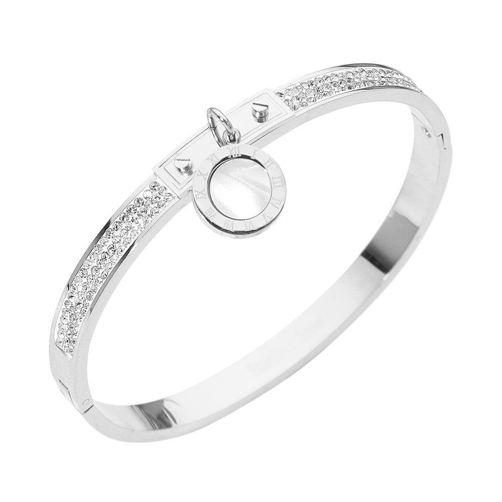 Details • Size : 0.25" H, 2.3" D • Charm Size : 0.7" L • Hinged Closure • Elegant charm bangle bracelet with a sleek profile and subtle sparkle accents. Designed for everyday styling or special occasions, it layers beautifully with other pieces or stands alone as a refined statement accessory, making it a timeless gift option. • CZ Cubic Zirconia • Stainless Steel