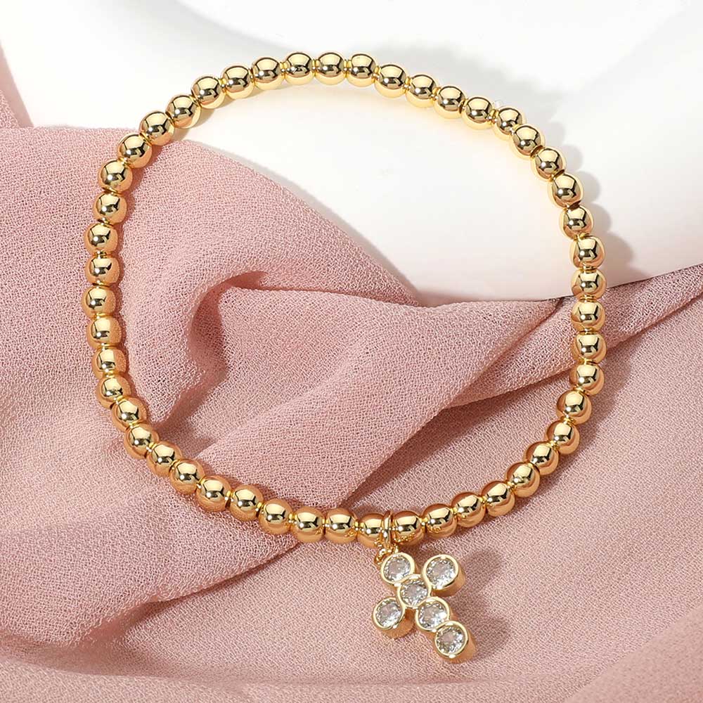Stainless Steel Stone Cross Charm Beaded Stretch Bracelet