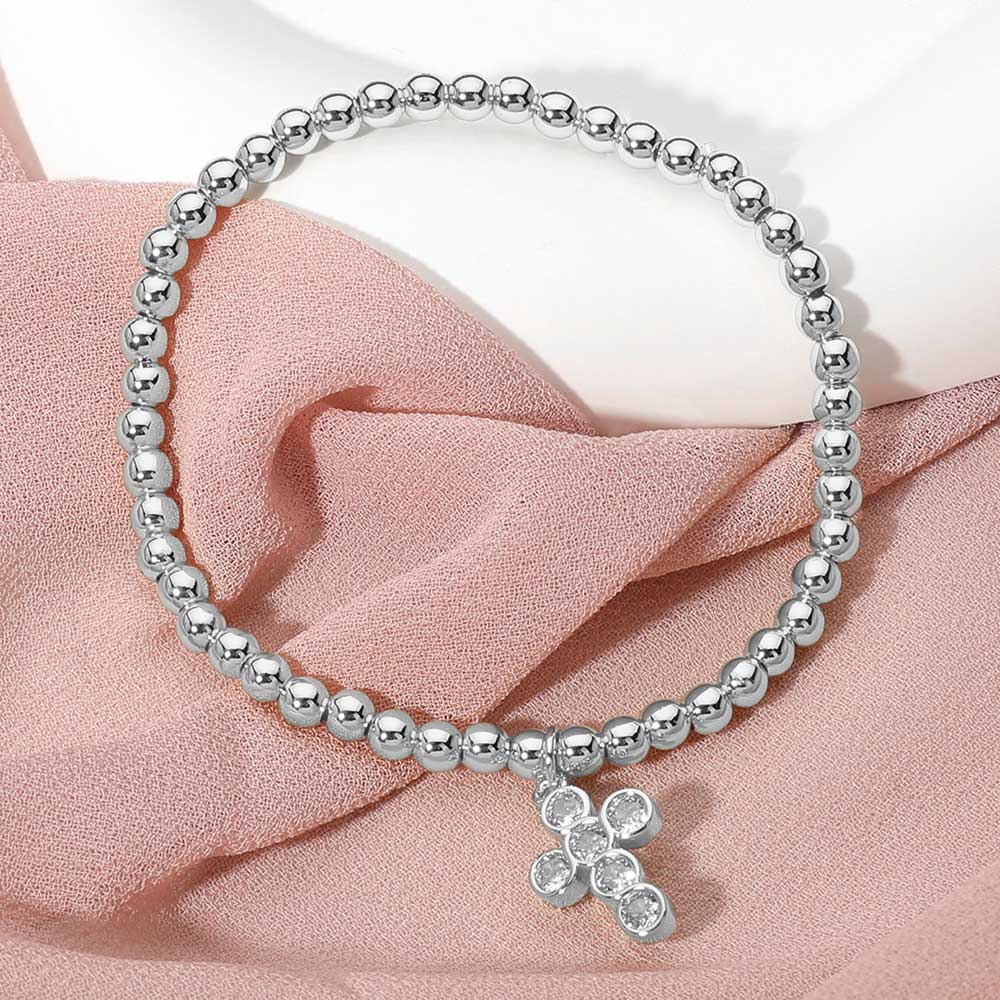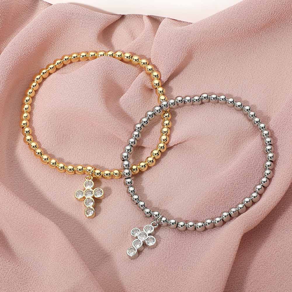 Stainless Steel Stone Cross Charm Beaded Stretch Bracelet