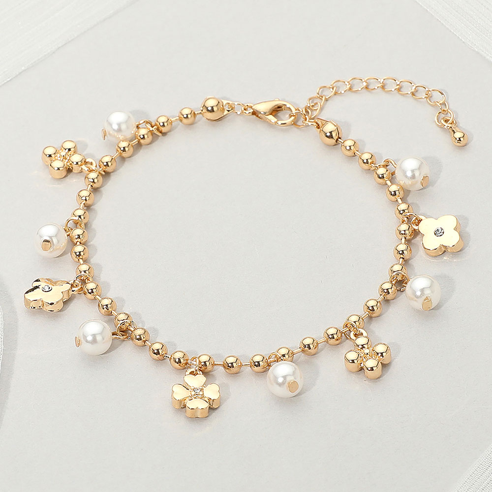 Details • Size : 0.2" H, 7" + 2" L • Charm Size : 0.4" L • Lobster Clasp Closure • This delicate bracelet features a mix of floral charms and pearl accents on a beaded chain for a graceful, feminine touch. The adjustable clasp ensures a perfect fit, making it an ideal accessory for both everyday wear and special occasions. • Lead and Nickel Compliant
