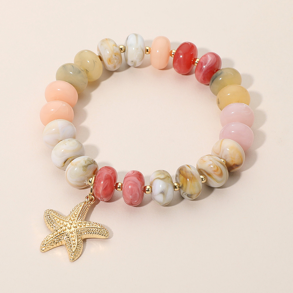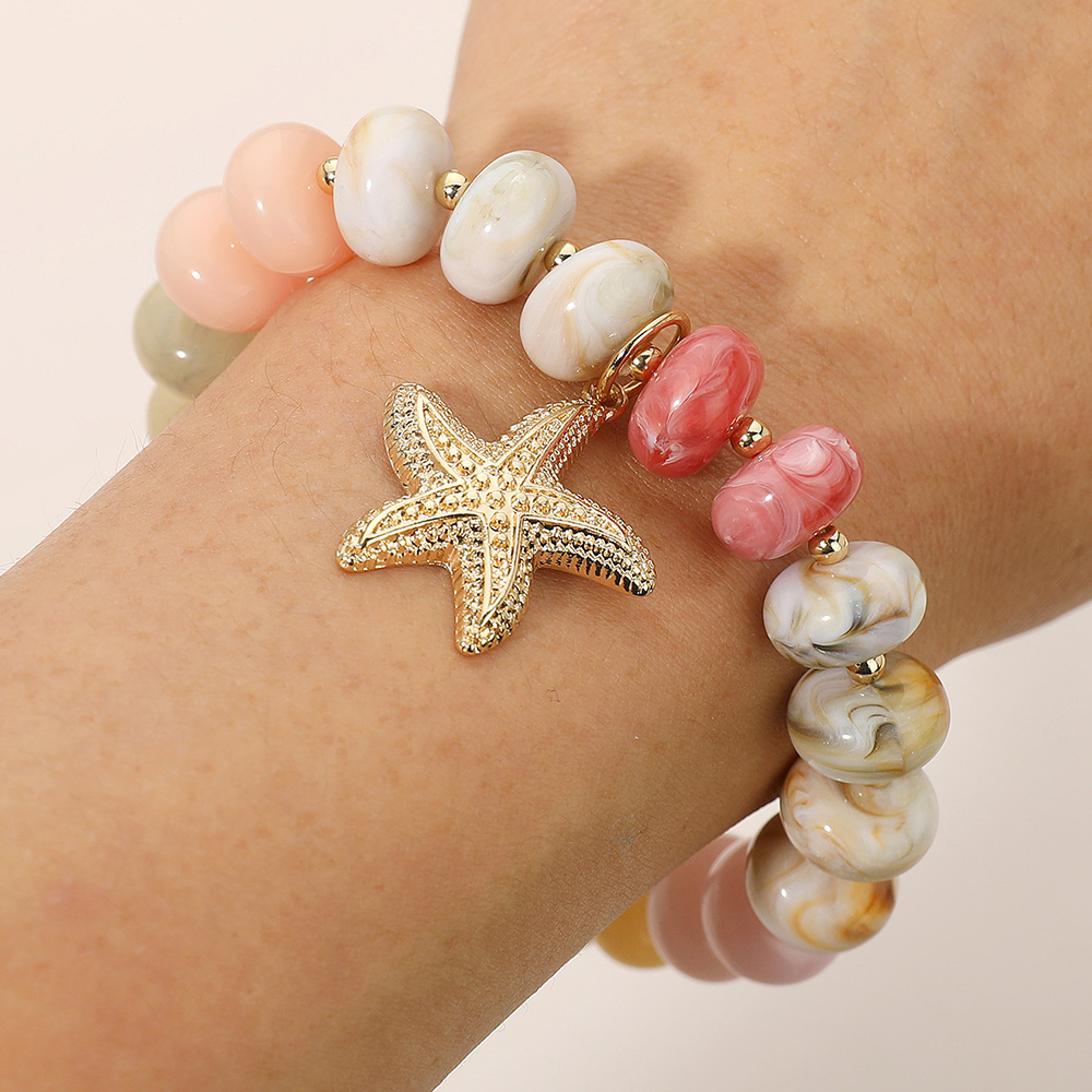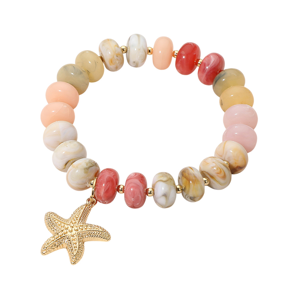 Textured Metal Starfish Charm Accent Resin Pebble Beaded Stretch Bracelet