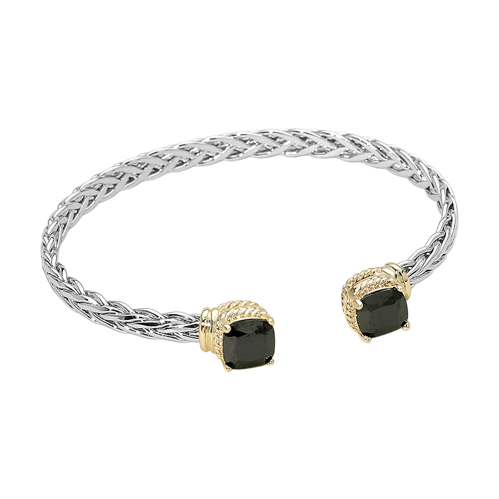• Refined open cuff bracelet featuring a braided band and square crystal end details. Designed with a structured silhouette and elegant sparkle, this versatile accessory pairs effortlessly with casual or dress looks and layers beautifully with other bracelets for curated styling.
